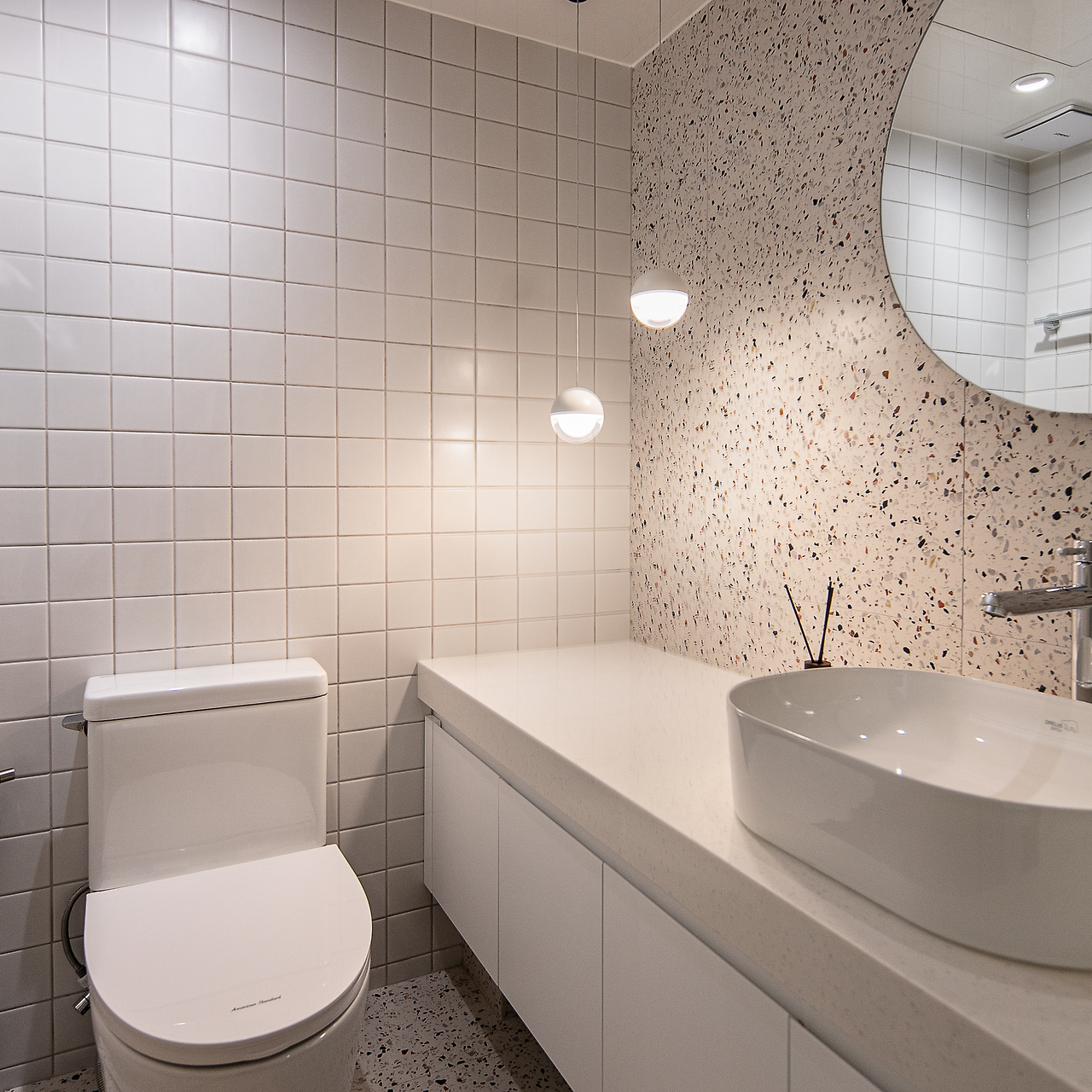 안방 욕실은 테라조 타일로 포인트를 주고 싶었다. 그레이 계열 테라조 타일을 생각했었는데, 디자이너님이 파랑, 빨강, 노랑 등 알록달록한 색이 들어간 테라조 타일을 추천해주셨고 거울 벽면과 바닥에 시공했을 때의 느낌을 3D 도면으로 보여주셨다. 나머지 벽면은 작은 정사각형의 화이트 타일로 추천해주셨다. 깔끔하고 심플한 느낌을 좋아하는 우리 부부에게는 나름 도전적인 시도였다. 결과적으로 알록달록한 테라조 타일 덕분에 안방 욕실은 카페 화장실 부럽지 않은 포토존이 되었다.