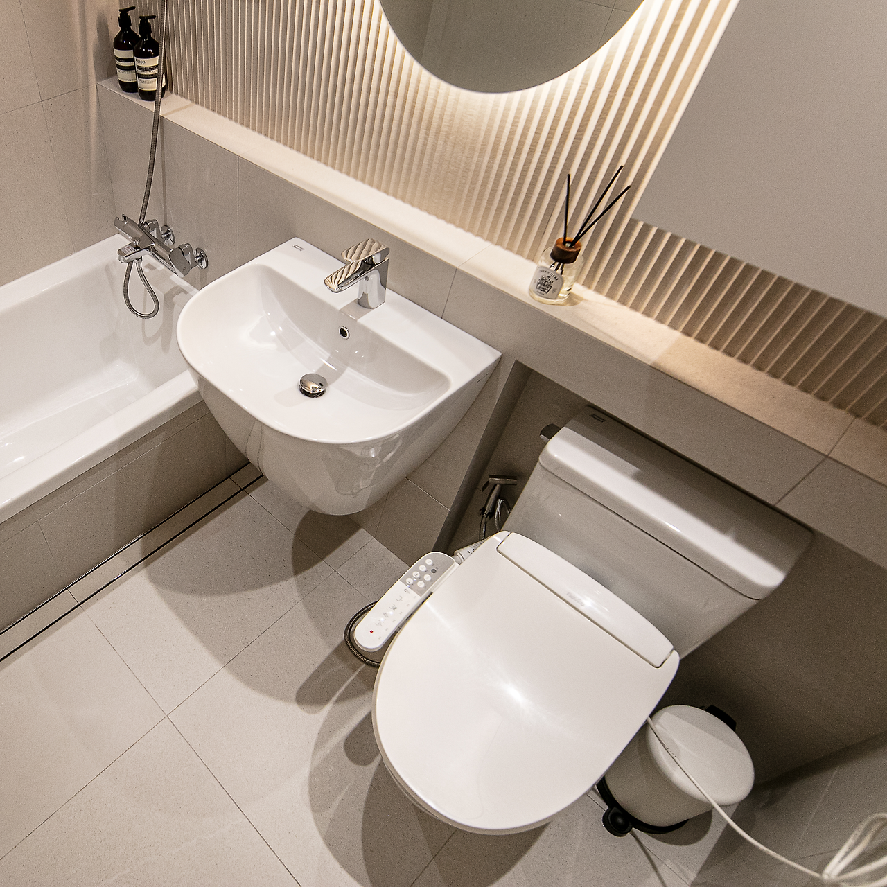 공용 욕실은 그레이 또는 베이지톤 600각 타일(600mm*600mm 크기의 타일로 이음선이 적게 보여서 공간을 더 넓어 보이게 한다.)과 거울 벽면의 그라운드 월 타일 봐 두었고, 욕실 젠다이는 졸리컷(타일 끝 선을 사선으로 컷팅하여 타일과 타일을 수직으로 부착하였을 때 틈을 최소화하는 것이다.)으로 마감하는 것으로 계획했다.