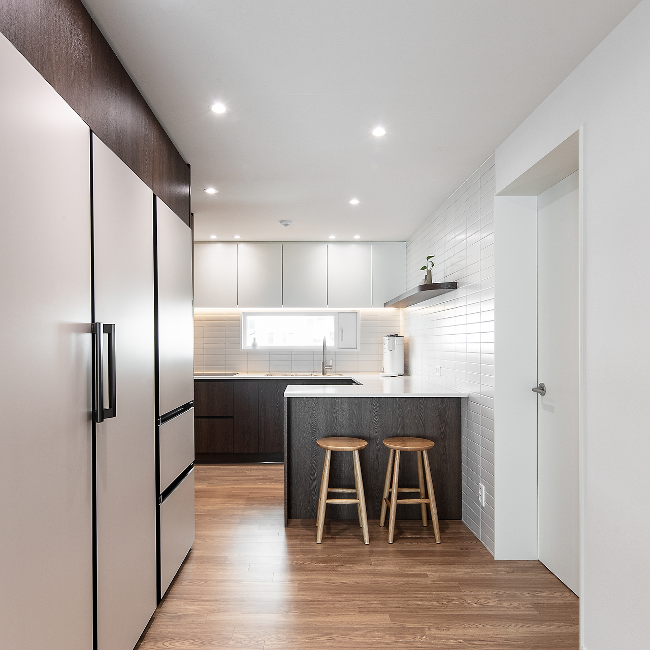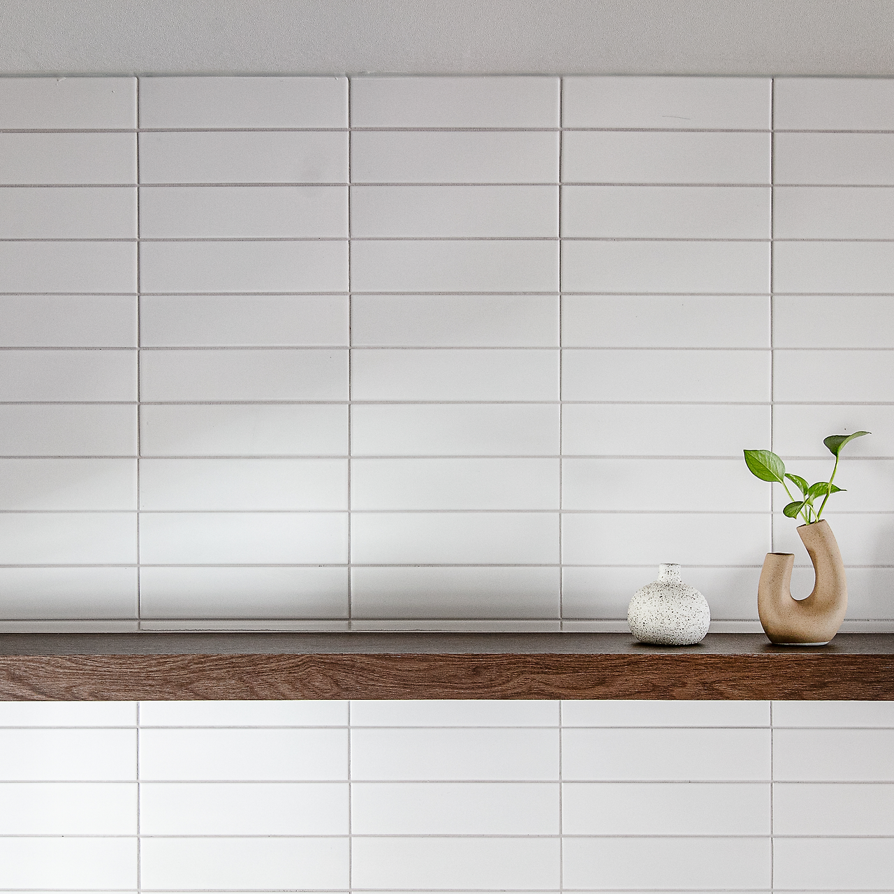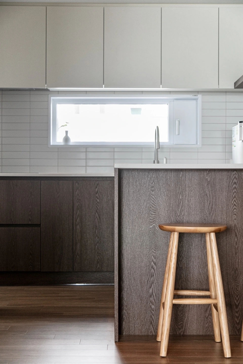 주방은 가로가 긴 직사각형 모양의 화이트 타일로 시공하였다. 고춧가루나 간장 등 양념으로 오염이 되면 잘 지워지지 않을까 걱정했지만 요즘 자재들이 어찌나 좋은지 감쪽같이 얼룩이 지워진다. 주방 상부장에 달린 간접조명을 켜면 타일이 핑크빛으로 물들고, 주방 통창으로 아침 햇살이 들어올 때 새하얀 타일이 조명처럼 빛을 낸다. 하얀 도화지와 같은 화이트 타일은 우리집 주방에서 다양한 분위기를 느낄 수 있게 해 준다.