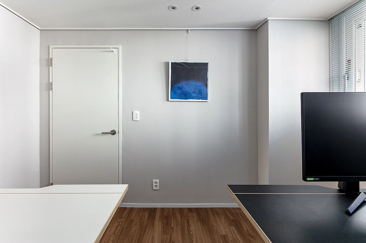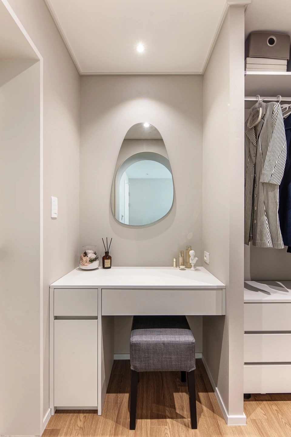거실과 주방, 현관 옆 작은방은 화이트 벽지, 안방은 따뜻한 느낌의 아이보리 벽지, 서재는 화이트와 블랙 가구 색상에 맞추어 그레이 벽지를 시공하였다.
