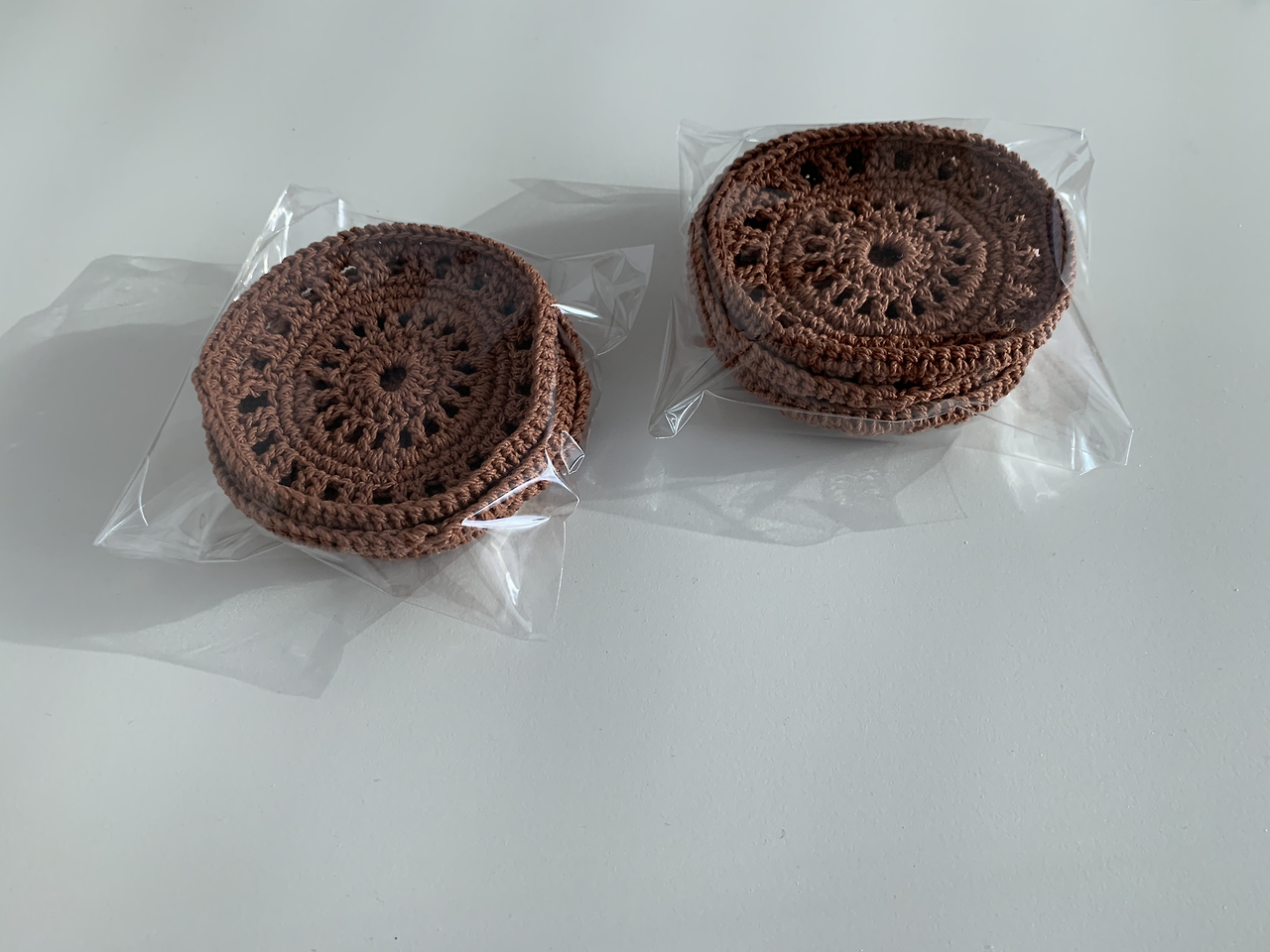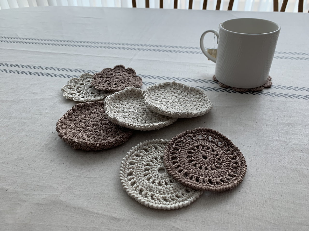 크기가 작고 무늬가 일정하게 반복되는 ‘티 코스터’ 뜨기로 뜨개질을 시작했다. 물론 ‘쟈스민스티치’(좌측 가운데 3개)는 유튜브로 여러 번 보며 따라 해 봐도 원하는 모양이 나오지 않아 뜨다가 다시 풀다가를 몇 번이나 반복했는지 모르겠다. 뜨개 방법이 어려운 편이기도 하지만, 영상에서 사용된 실과 내가 쓰는 실 두께가 달랐기 때문에 내가 원하는 크기로 뜨기 위해서 도안에 없는 여러 방법을 연구해야 했다. 보통 티 코스터는 30분 정도면 한 개를 완성할 수 있다.