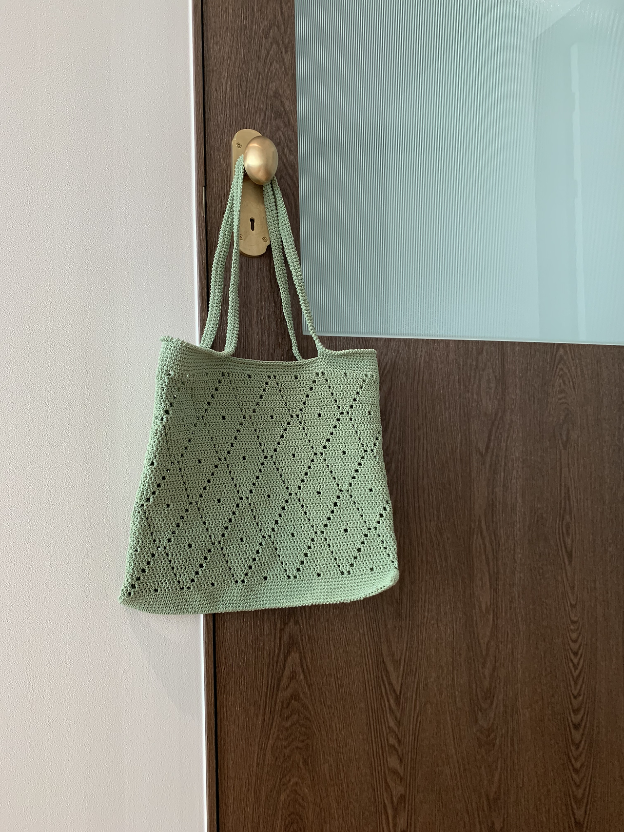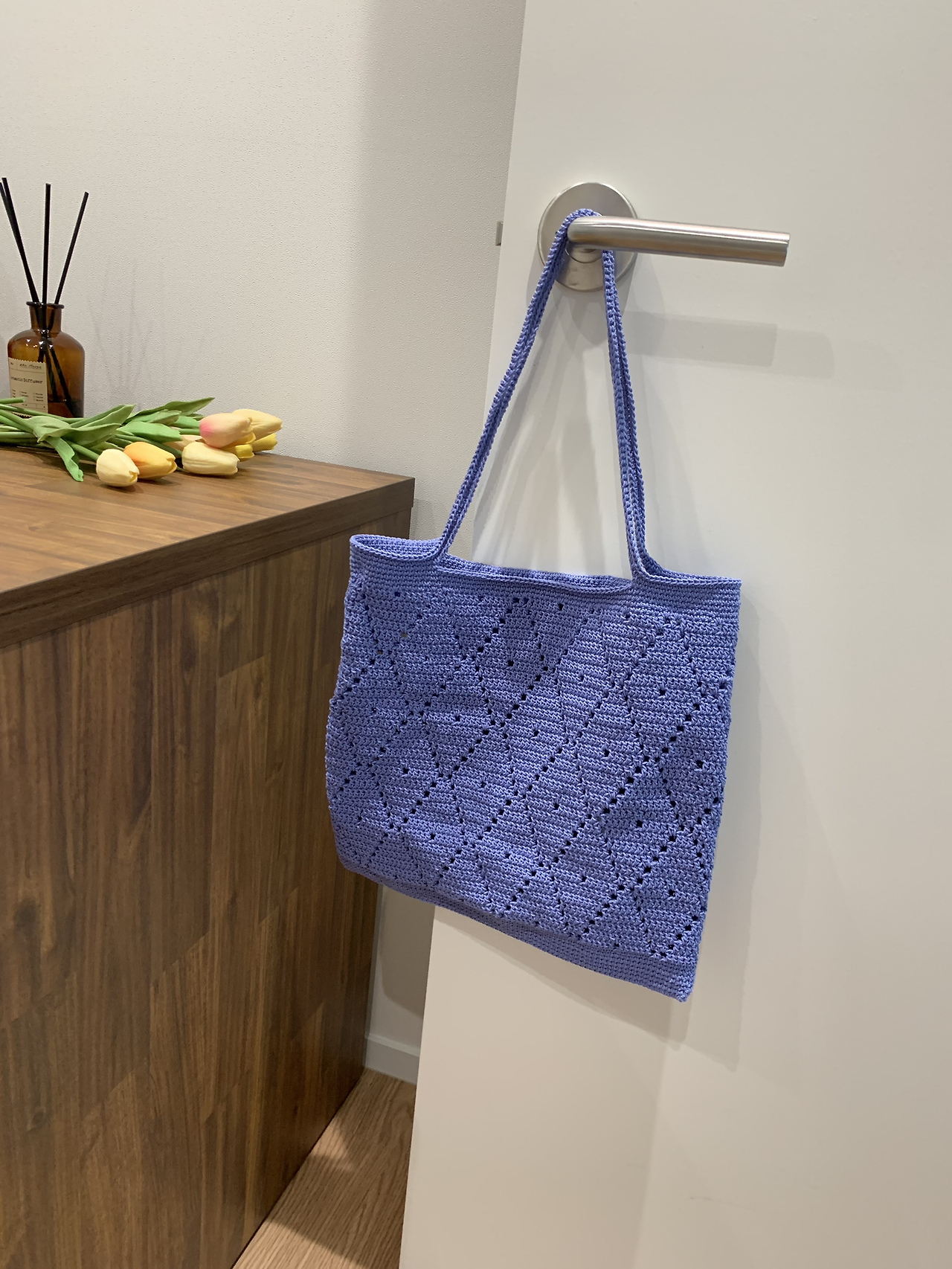 이번에도 두께감 있는 털실로 가방을 뜨는 영상을 보면서 가방 뜨는 방법을 익혔다. 내 실은 털실보다는 얇았기 때문이 기본 코 수도 늘려야 했고, 그에 따라서 반복되는 패턴의 수도 늘어났다(영상에서 설명한 것보다 내가 뜬 가방의 다이아몬드 패턴 개수가 더 많다.). 패턴을 만드는 규칙을 터득하고 나니 쟈스민스티치를 뜨던 때보다 금방 가방 하나를 완성했다.
