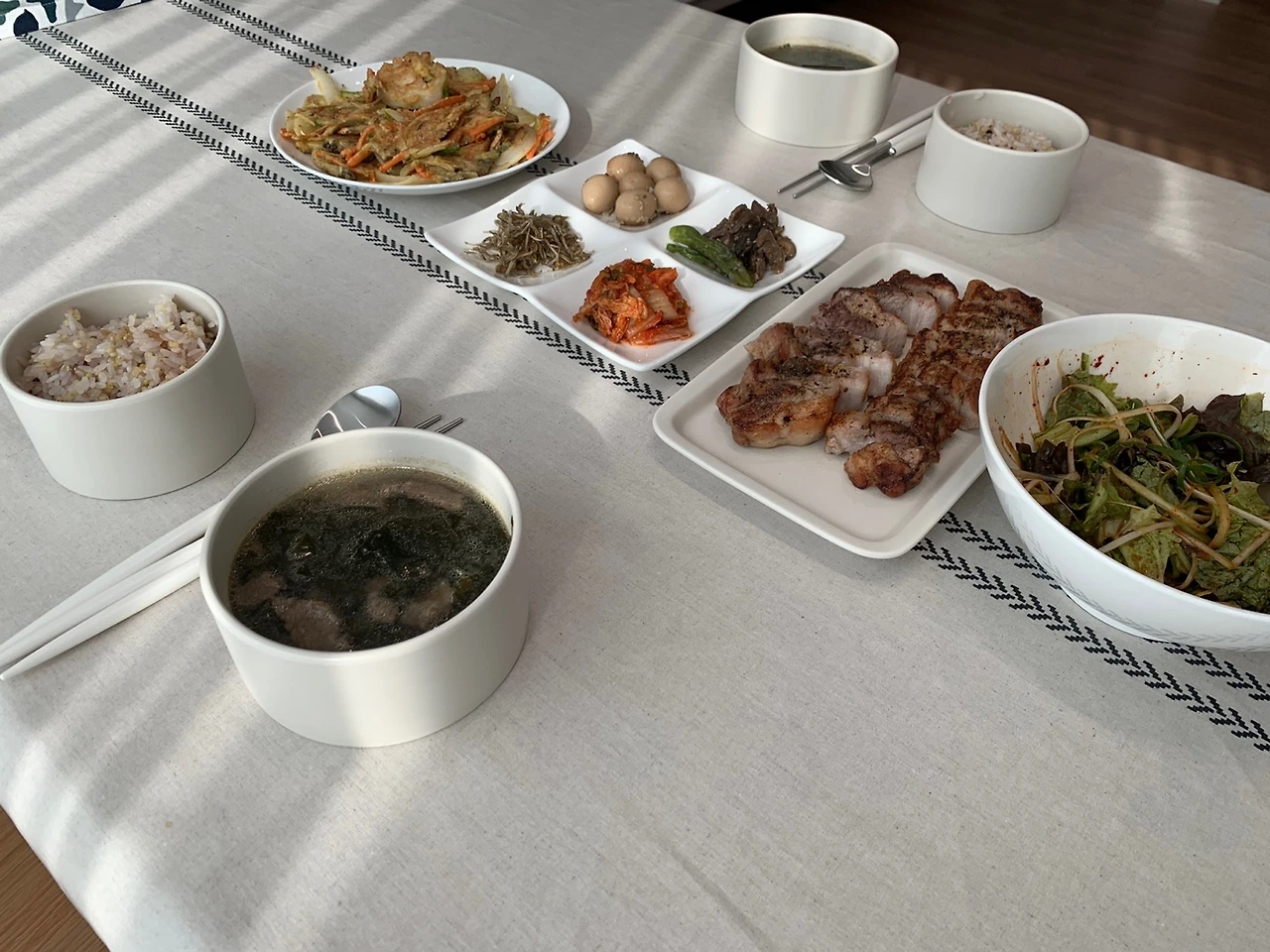 오전에는 예약한 생일 케이크를 찾아오고, 재택근무를 하는 남편에게 따뜻한 생일상도 차려주었다. 저녁에는 소화가 잘되고 기력 회복에도 도움이 되는 삼계탕을 배달시켜 먹기로 하였으나, 시부모님 두 분이서 식사하실 때 드실 수 있도록 미역국(친구가 신혼여행 가서 보내준 울릉도 자연산 미역으로 끓인 미역국. 자연산은 확실히 다르다.)과 버섯전을 넉넉히 준비했다.