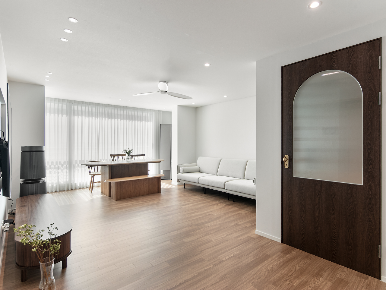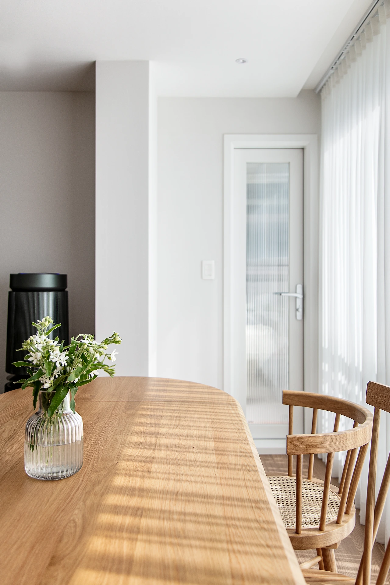 월넛톤 중문과 주방 가구들, 마루와 컬러가 제법 잘 어울린다는 것을 디자이너님과 함께 확인한 후 테이블을 구입했다. 한남동 쇼룸이 오픈한 지 얼마 되지 않아 오픈 할인이 적용되었고, 테이블과 벤치, 체어를 세트로 구입하면서 추가 할인 혜택을 받았다(이후에 구입한 거실장도 함께 오픈 할인을 해주셨다.).