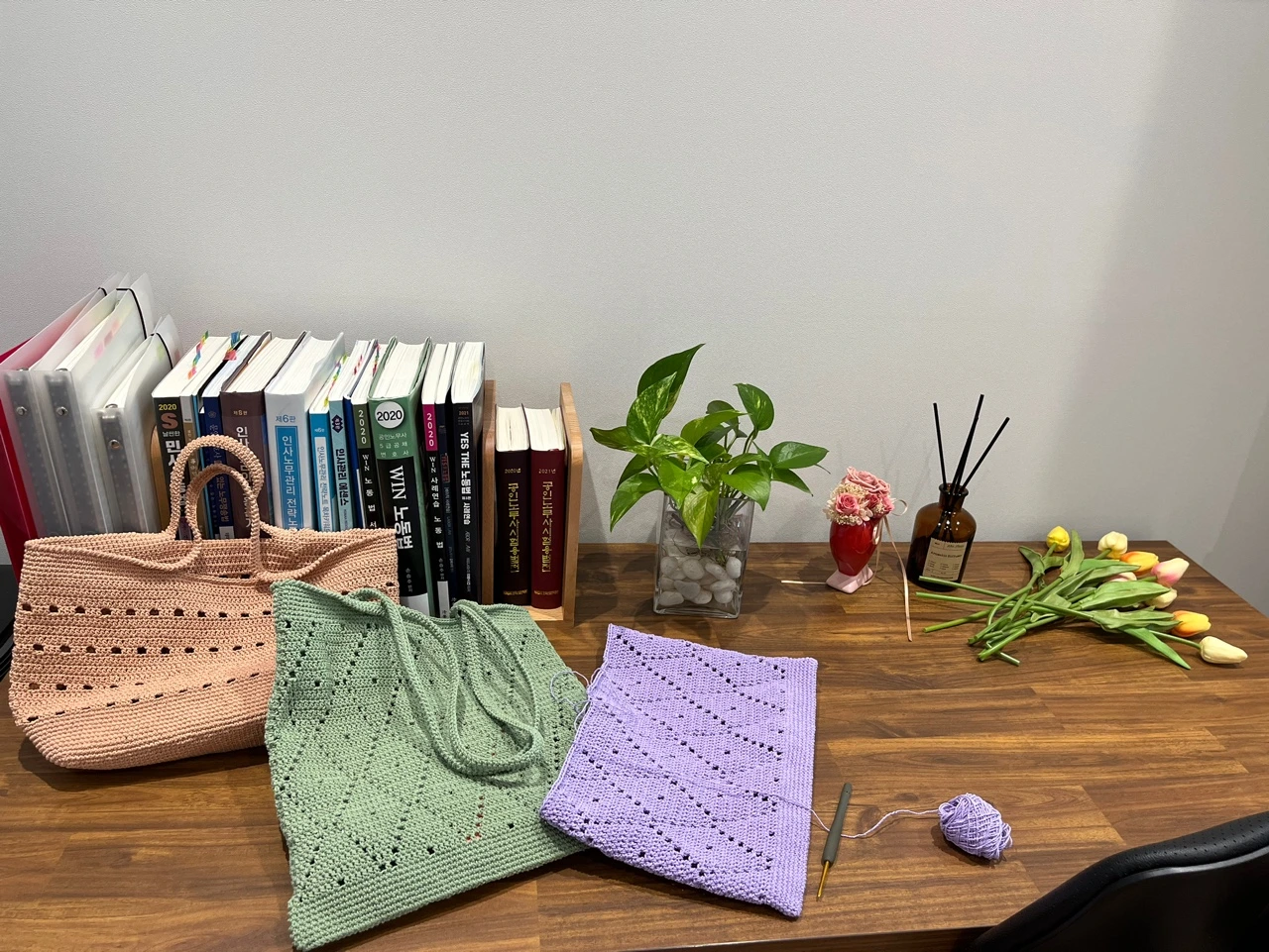 지난여름 시험을 본 후 결과를 기다리며 휴식 시간을 갖고 있습니다. 주로 뜨개질을 하면서 집에서 시간을 보내고 있는데, 티코스터를 뜨거나 인형을 만들기도 하고, 요즘에는 가방을 뜨고 있습니다.