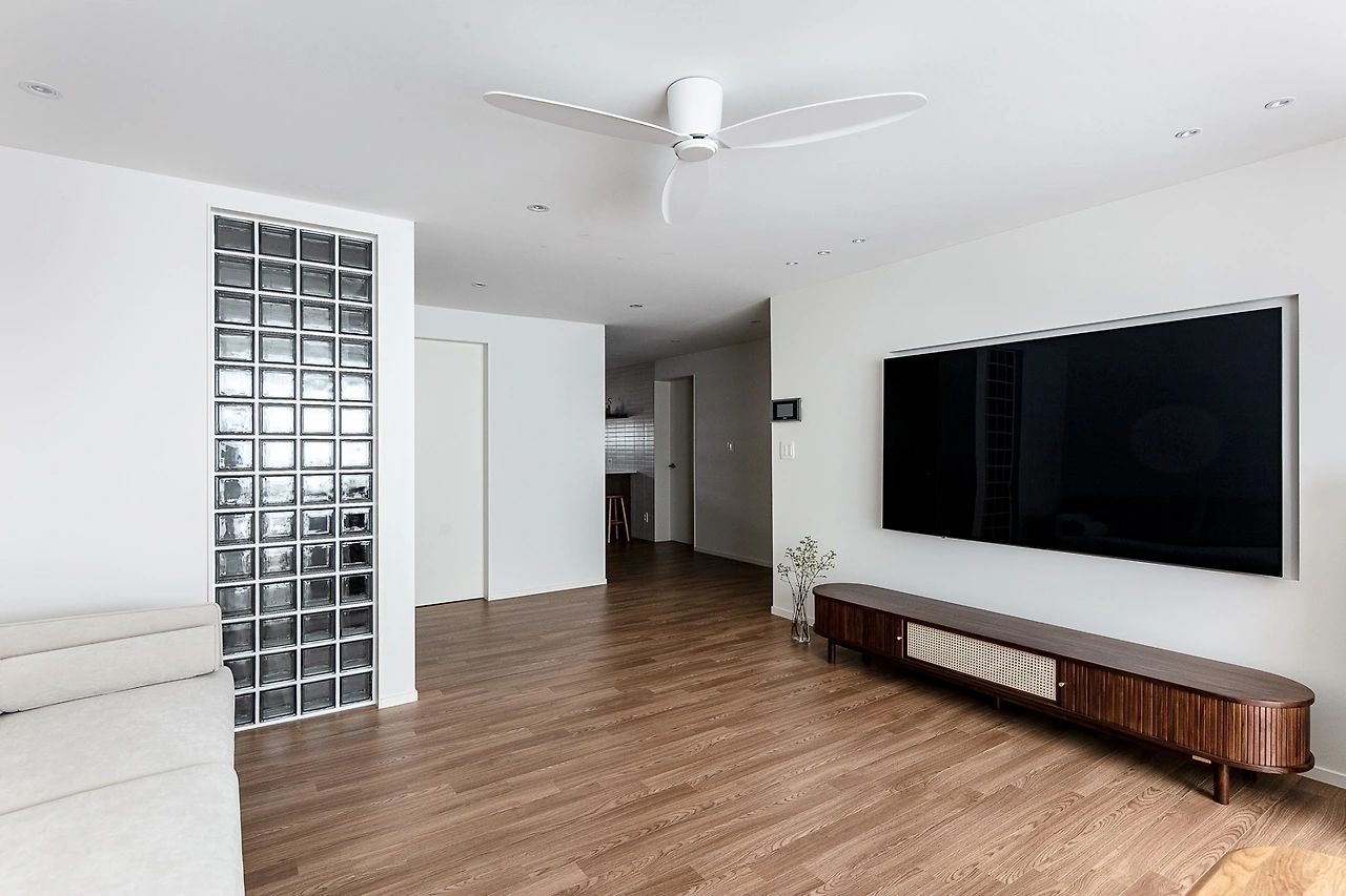 유리블록이 있어서 현관 벽이 답답해 보이지도 않고, 오히려 거실의 포인트를 살려주는 것 같아서 너무 만족스럽습니다. 유리블록 너머로 보이는 간접조명 불빛은 정말 예뻐요. 이 사진을 찍기 위해 간접조명 밝히고 후다닥 달려와 사진을 찍으셨을 사진작가님 정말 고생하셨어요!