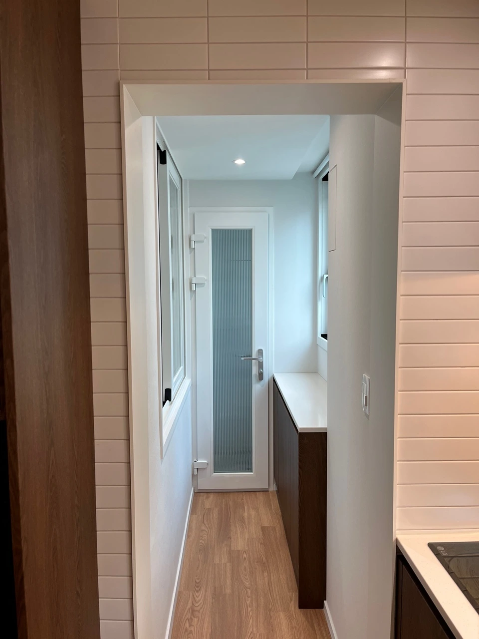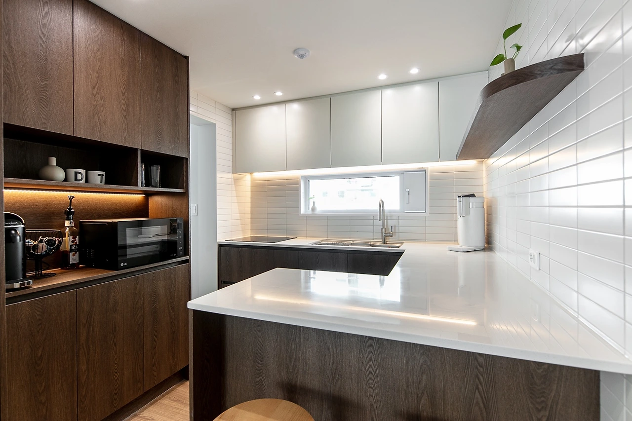 좁은 주방은 구축 리모델링에서 가장 큰 고민거리이지만 발코니를 확장하여 주방을 더 넓게 쓸 수 있습니다. 수납공간도 확보되고 큰 창을 통해 환기도 시킬 수 있어서 만족스럽습니다.