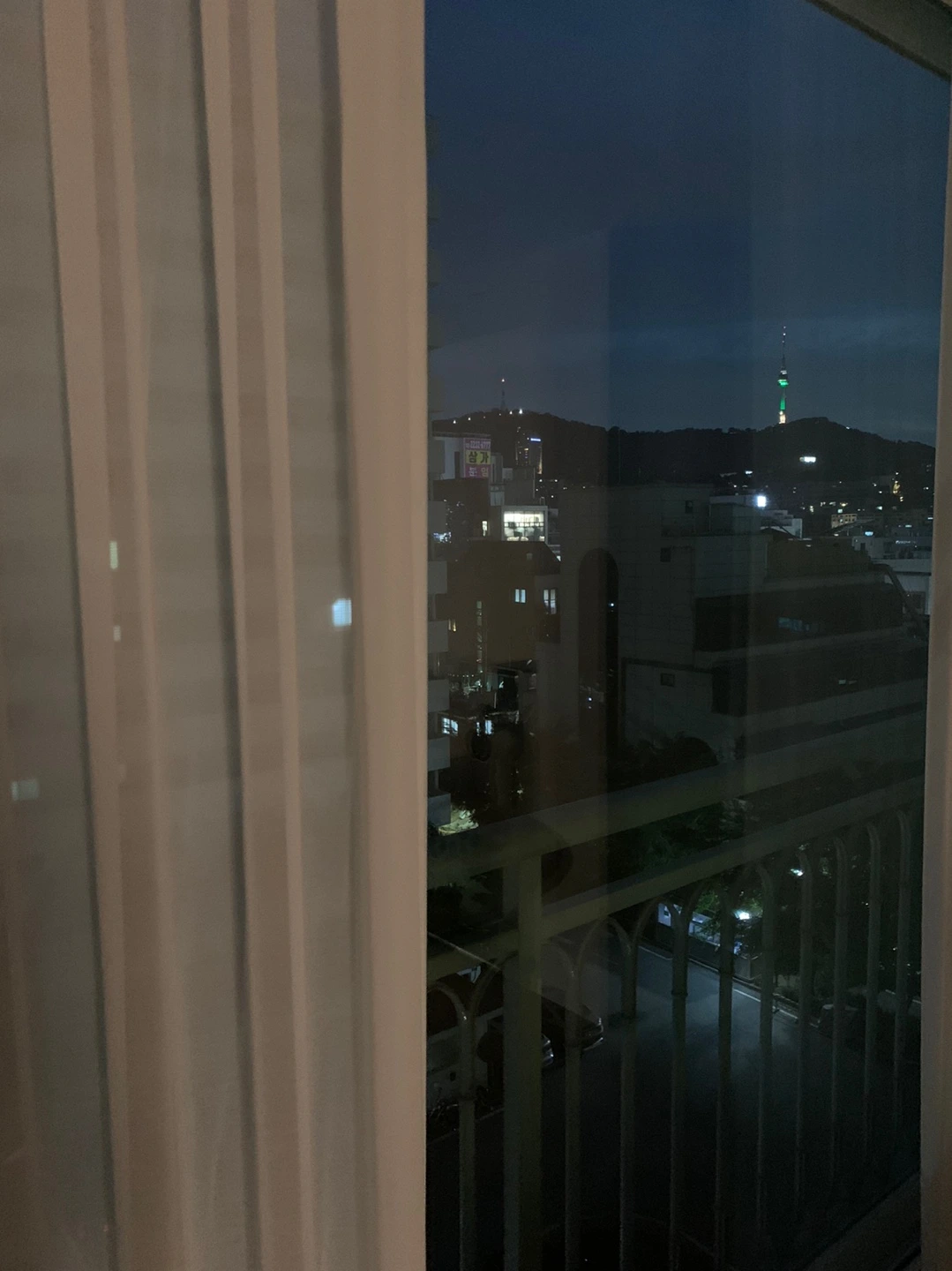 거실에서 남산이 보입니다. 거실에서 앞동이 정면으로 보여서 평소에 커튼을 쳐 놓고 생활하고 있는데, 가끔 창밖을 바라보면 저렇게 예쁜 남산 뷰가 펼쳐집니다.