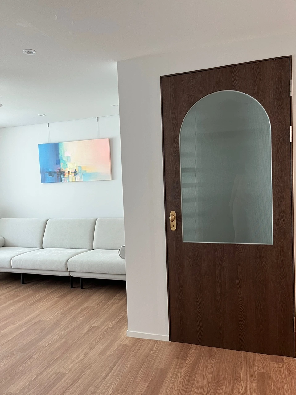 저희 집은 현관부터 환합니다. 인공조명(신발장 아래 간접조명)과 자연광(유리블록을 통해 들어오는 햇빛)이 조화로워요. 중문은 제가 원했던 월넛 우드 중문으로 제작해주셨어요. 실장님과 유리 재질이나 손잡이도 고르고, 유리 높이까지 철저하게 계획해서 제작한 중문입니다.