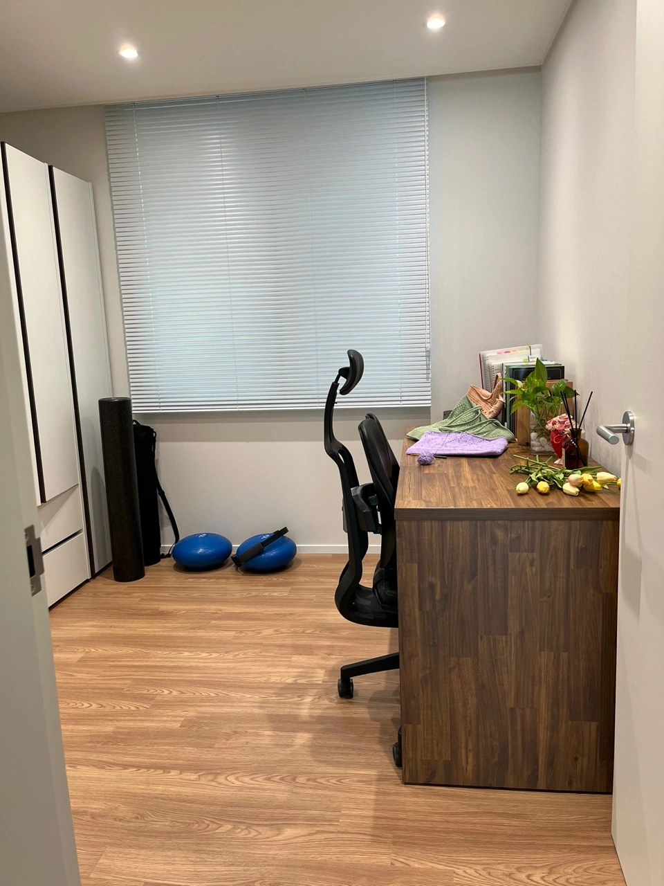 현관 옆 작은방은 기성 옷장과 스타일러(사진에는 안 보이네요), 책상이 있습니다. 남편이 영상 회의를 할 때는 여기서 공부를 하기도 하고, 집중이 필요한 모의고사를 볼 때에도 주로 이 방에 있습니다.