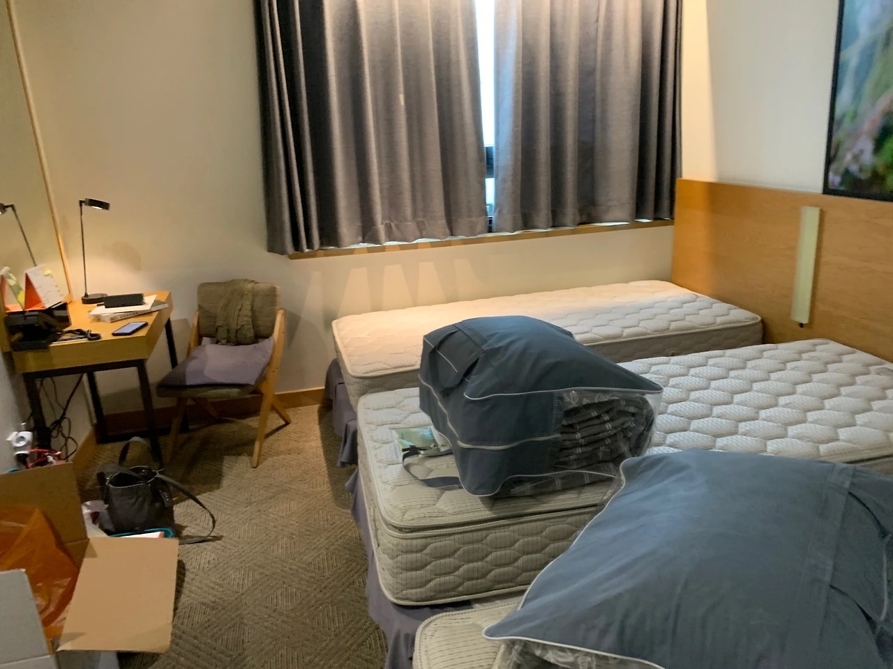 우리 집에서 가까운 거리의 호텔(숙박시설)에 도착했고, 주차장에 대기 중인 선생님께서 우리 몸과 캐리어에 소독약을 뿌린 후 우리가 머물게 될 호실을 안내해주셨다. 엘리베이터로 가는 길목, 엘리베이터 안은 모두 비닐로 쌓여 있었다. 우리가 머물었던 14층에 도착하자 복도에 공기청정기 같은 기계가 무섭게 돌아가고 있었다.