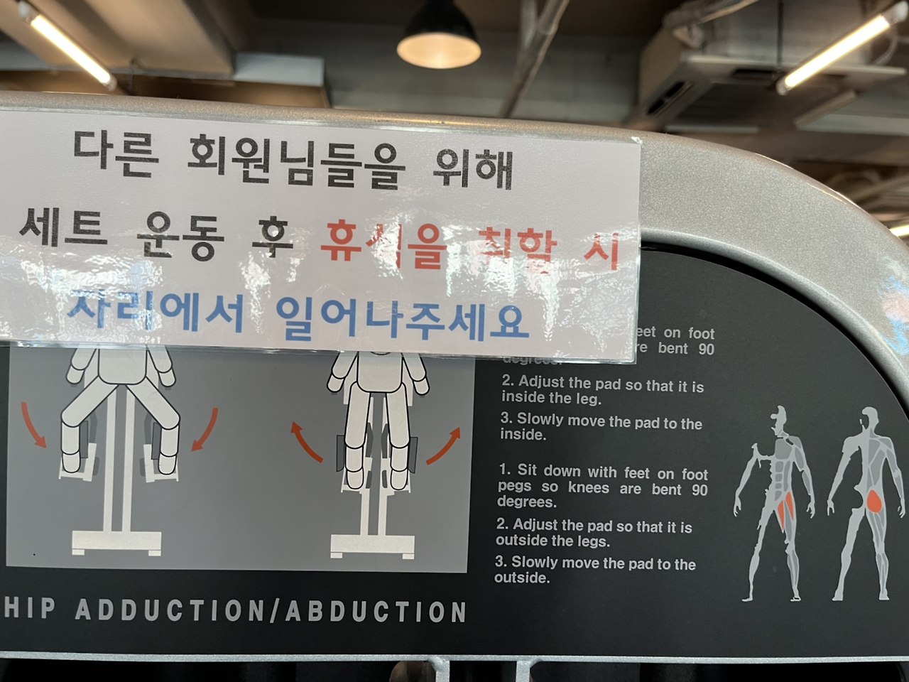 근력운동은 기구를 이용해서 한다. 별도로 PT를 받지 않기 때문에 자세를 바르게 잡기에는 기구를 사용하는 편이 났다. 대부분의 운동기구에 사용법이 그림과 함께 설명되어 있고, 인터넷 포털이나 유튜브 등에서 기구 이름(하단 오른쪽 사진에서 'hip adduction/abduction'이 기구 이름이다.)을 검색하면 올바른 자세와 자극이 와야 하는 부위 등을 설명해주는 동영상도 많다.