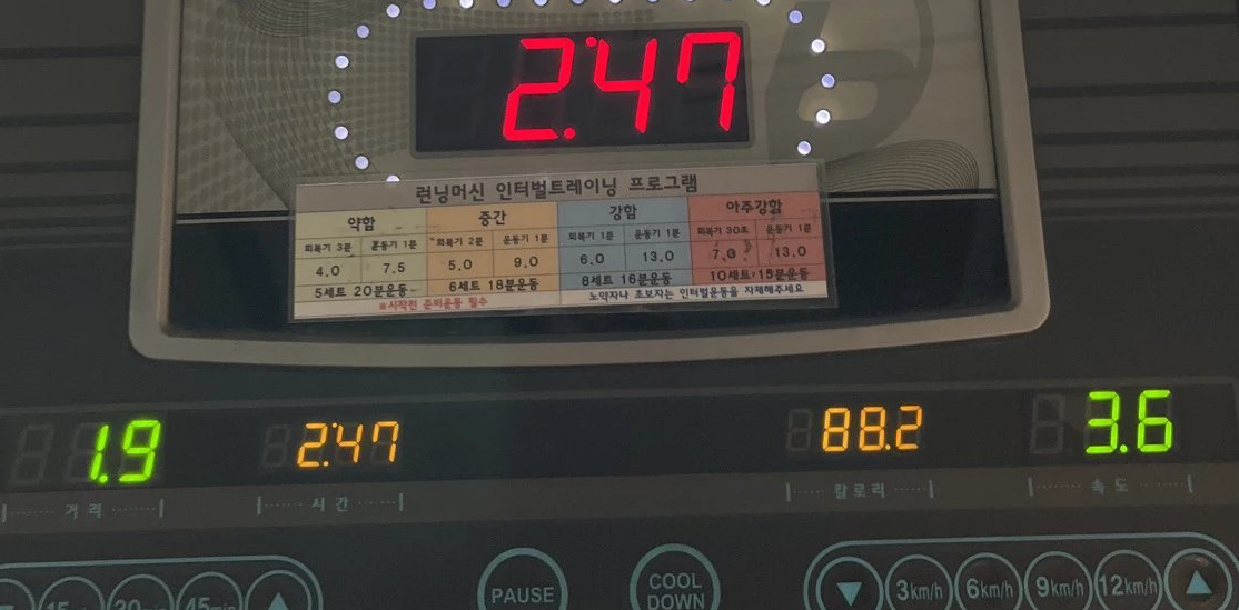 유산소 운동은 요즘 유행하는 인터벌 트레이닝으로 진행한다. 헬스장 러닝머신에 친절하게 하는 방법이 붙어있어서 그대로 따라 하는 중이다. 나는 중간 강도로 하고 있다.