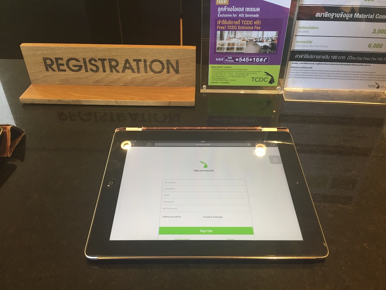 TCDC 치앙마이의 1층은 카페와 갤러리, 2층은 디자인 도서 중심의 라이브러리, 3층은 오피스로 되어있다. 2층의 라이브러리를 이용하려면 입구에서 등록을 해야 하는데, 여행자로서 등록하려면 여권이 필요했다. 준비해간 여권을 꺼내어 직원분들의 안내를 받으며 비치된 태블릿으로 회원 등록을 하였다. 치앙마이에서 이전에 방문했던 다른 공간들은 종이에 쓰거나 직원분에게 말하거나 해서 입장을 했다면 태블릿으로 등록을 하니 조금 생경하게 느껴졌다.