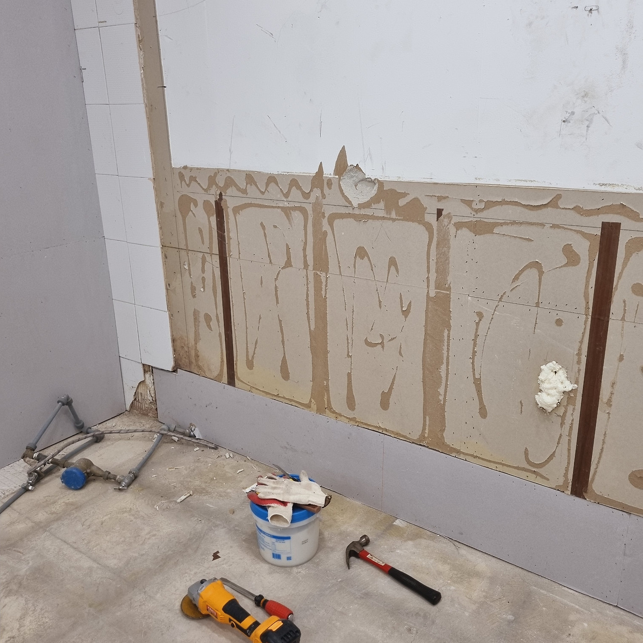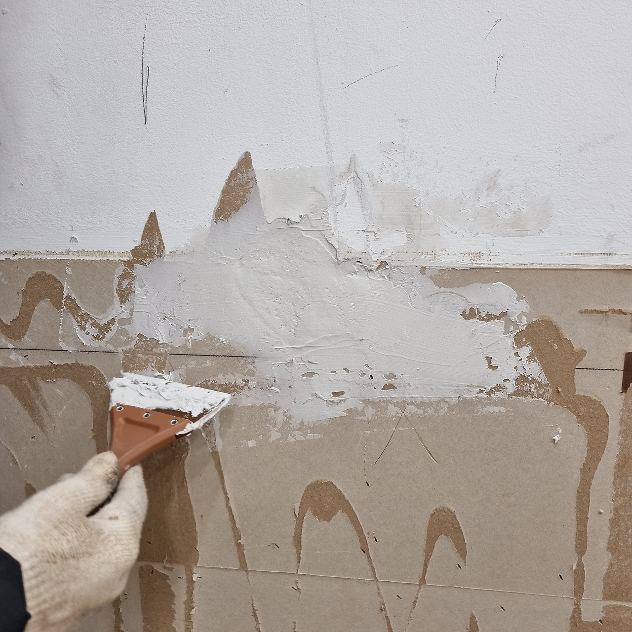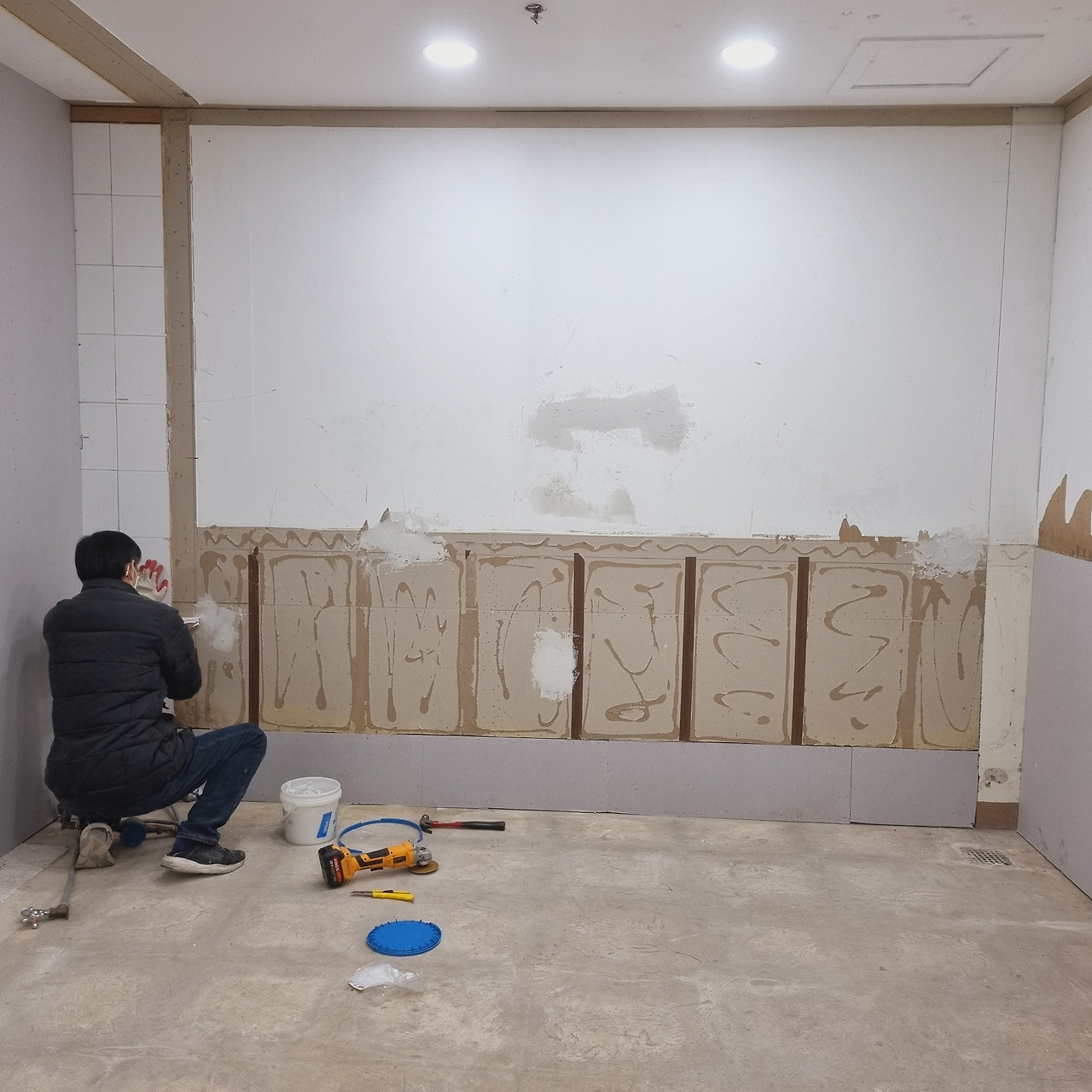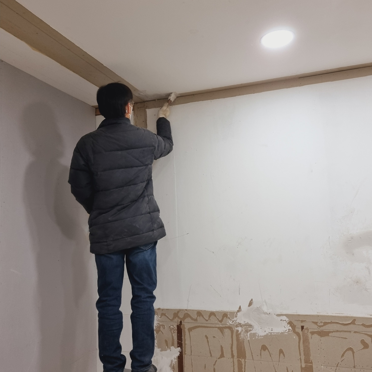 기본적인 청소를 마친 후 우리는 곧바로 평탄화 작업에 돌입했다. 보통 퍼티 작업이라고 부른다. 핸디코트라고 불리는 촉촉한 돌가루 반죽으로 이곳저곳 움푹 팬 곳들을 메꾸고 매끈하고 평탄하게 마감을 한다. 잘 마르기를 기다렸다가 필요하면 샌딩이나 사포질을 좀 더 하고 다듬은 후 페인트를 칠할 예정이다. 우리 서로 예술에 세공까지는 하지 말자고 타협했다. 적당히 하자. 갈 길이 멀다.