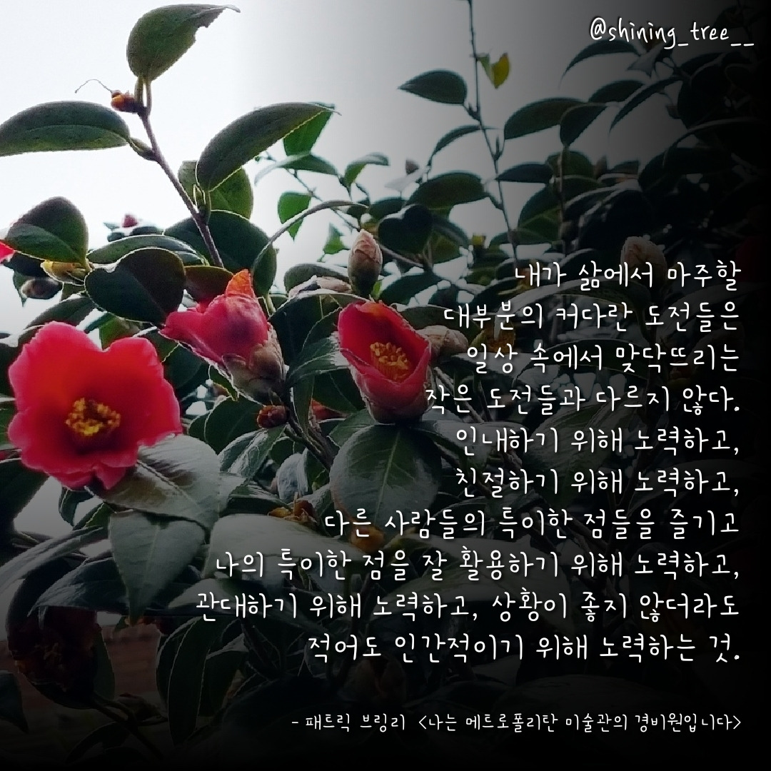 오늘 아침은 내가 일을 벌이는 것은 잘해도 항상 뒷수습은 못 한다며 잔소리를 해댄다. 나더러 성격이 급하고 욕심이 많아서란다. 언제는 몸이 약하고 체력이 달려서 그렇다고 하더니 사랑이 어떻게 변하니! 맞는 말을 듣고 나면 더 화가 나는 법이다. - 남편한테 정혜신 님의 <당신이 옳다>를 권해야겠다. 이 사람아, 지금은 옳은 말이 아니라 공감의 말이 필요한 순간이야. 그것도 몰라? 충조평판은 아프다고! - 물론 나도 알고 있다. 이건 본래 나의 일이다 생각하면 될 것을, 여전히 남의 일을 마지못해 해주고 있다는 마음 때문이기도 하다는 걸. 똑같이 힘들게 늦게까지 일하고 와서 내가 밥을 차렸는데 치우기까지 해야 돼? 왜 나만 해야 돼? 세상 가장 유치하다는 걸 알면서도 때 되면 스멀스멀 찾아오는 알아주길 바라는 바로 그 마음 말이다. 이때만큼은 이미 매일 받고 있는 사랑은 안드로메다로 보내버린 지 오래다. 이봐, 이봐! 마음이 이 지경이 됐을 때는 쉬어야 한단 말이야. (듣고 있니? 아니, 읽고 있니?! 제대로 차근차근 똑바로 읽어요!)