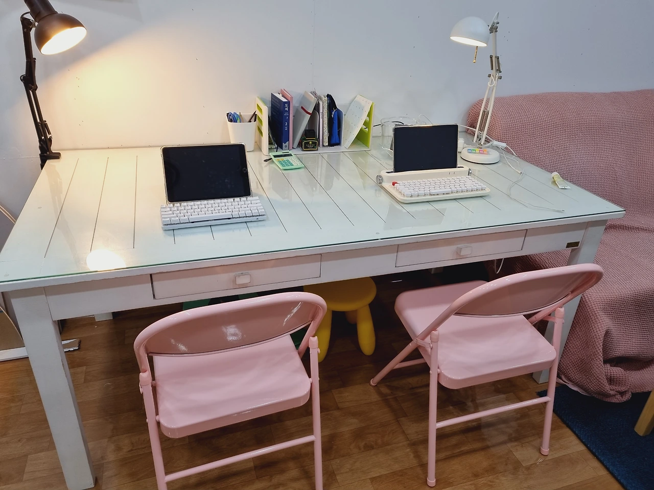 어제는 친구가 이사를 하면서 커다란 테이블을 나눔해주었다. 가로 95 세로 180 센티미터에 제법 크다. 우리 차에 실릴까? 우리의 산타에게는 불가능이란 없다. 무사히 안전하게 싣고 왔다. 유리까지 완벽하고 서랍도 있다. 아주 튼튼하고 좋다. 디자인도 예쁘고. 테이블을 중간에 놓고 둘러앉으면 여섯 명 정도는 거뜬할 듯하다. (자! 이제 어서 앉아서 글을 쓰시오.) 어제 너무 늦어서 밤에 와서 겨우 조립만 해놓았다. 아직 미완성이다. 공간에 따뜻하고 부드러운 빛을 더해줄 예쁜 펜던트 조명도 달고 싶다. 나는 참 핑크 코랄을 좋아하는군요. 공간을 채우고 꾸미다 보니 내가 무엇을 좋아하는지 나의 취향을 한 번 더 확인하게 되기도 한다.