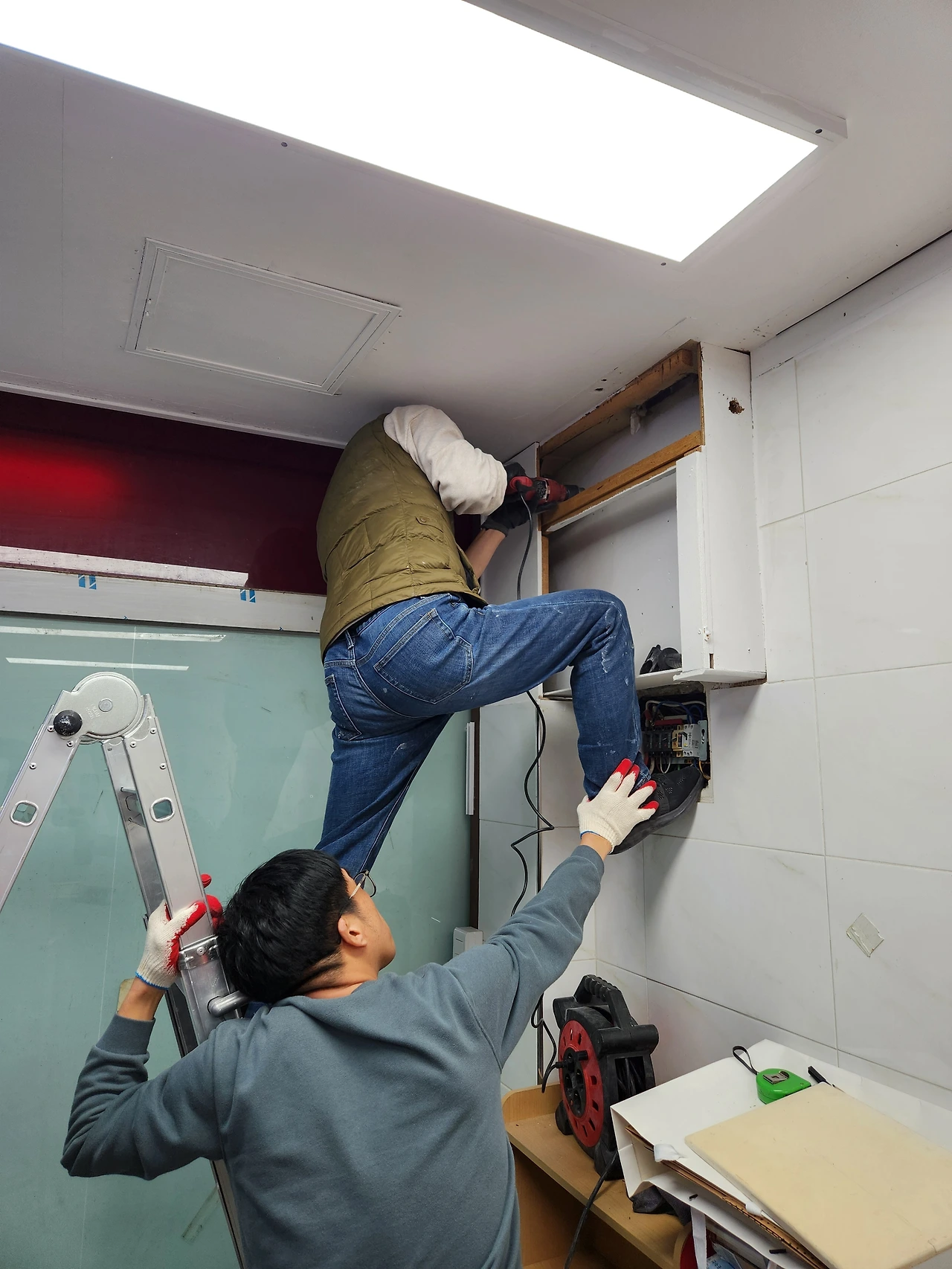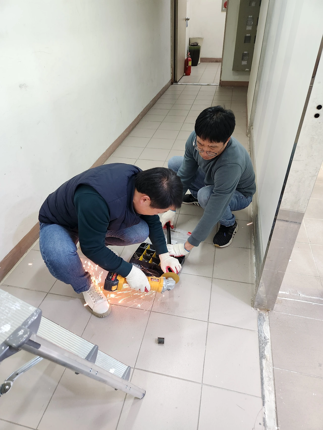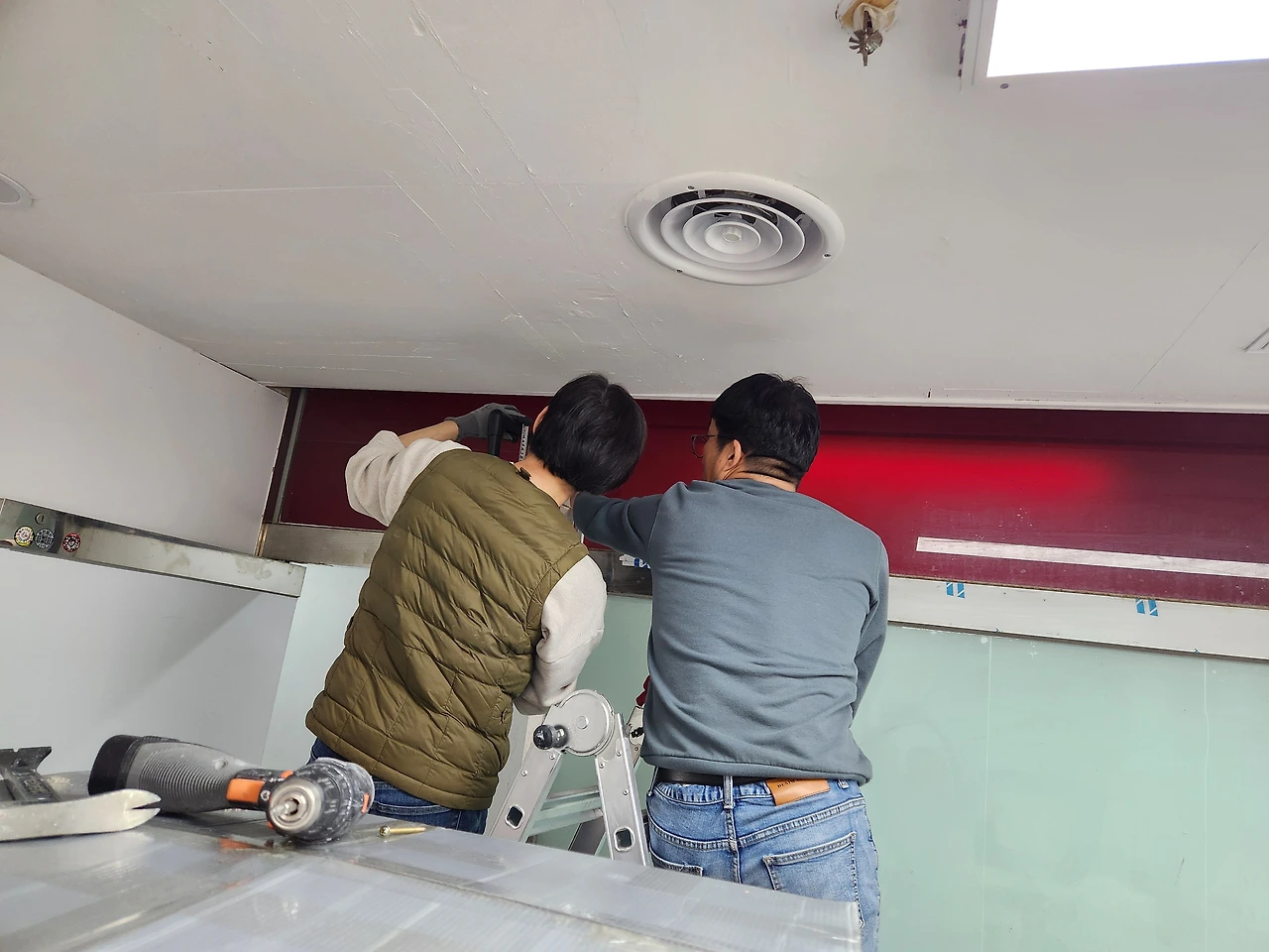 3인조 즉석 협업! 각 맞춰 센터 맞춰 수평 맞춰 또 예술하셨습니다. 덕분에 일정대로 무사히 멋지게 오픈하셨네요. 역시나 서비스로 못도 몇 개 박아드리고 철망도 걸어드리고.