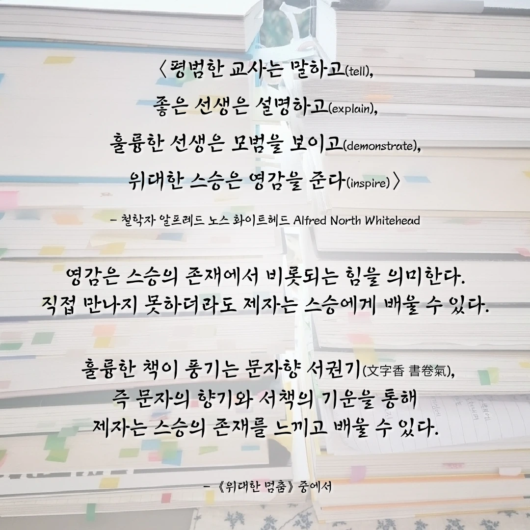 훌륭한 책이 풍기는 문자향 서권기(文字香 書卷氣), 즉 문자의 향기와 서책의 기운을 통해 제자는 스승의 존재를 느끼고 배울 수 있다.