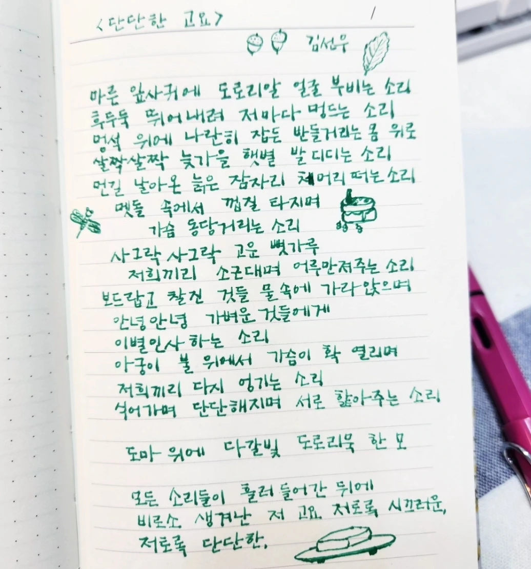 마른 잎사귀에 도토리알 얼굴 부비는 소리 후두둑 뛰어내려 저마다 멍드는 소리 멍석 위에 나란히 잠든 반들거리는 몸 위로 살짝살짝 늦가을 햇볕 발 디디는 소리 먼 길 날아온 늙은 잠자리 체머리 떠는 소리 맷돌 속에서 껍질 타지며 가슴 동당거리는 소리 사그락사그락 고운 뼛가루 저희끼리 소근대며 어루만져 주는 소리 보드랍고 찰진 것들 물속에 가라앉으며 안녕 안녕 가벼운 것들에게 이별인사 하는 소리 아궁이 불 위에서 가슴이 확 열리며 저희끼리 다시 엉기는 소리 식어 가며 단단해지며 서로 핥아주는 소리