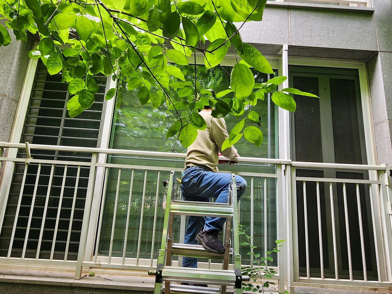사수가 높은 곳에서 사다리 작업을 할 때 조수의 역할이 특히 더 중요해진다. 손과 발을 넘어 눈도 되어주어야 한다. 지켜보는 눈! 막상 사다리를 직접 가까이에서 보면 어떻게 이걸 믿고 올라가서 일하지 싶을 만큼 부실해 보이는 것이 사실이다. 사다리를 믿고 올라가 일을 하는 것이 아니라 사다리 아래를 지켜주는 사람을 믿고 올라가는 것이다. 이 순간만큼은 사수의 안전을 조수가 지킨다. 안전은 기본이자 제일이다. 시선이 미처 닿지 않는 모서리나 장애물도 조심할 수 있도록 미리 알려주어야 한다. 사수가 사다리 위에서 작업을 하는 동안 가능하면 크게 움직이거나 오르락내리락할 일이 없도록 손발 빠르게 움직이는 것도 조수의 중요한 덕목이다. 몇 번 왔다 갔다 하면 점심시간이 되기도 전에 3 천보는 거뜬히 채운다. 조수의 복지를 위해 무릎보호대라도?