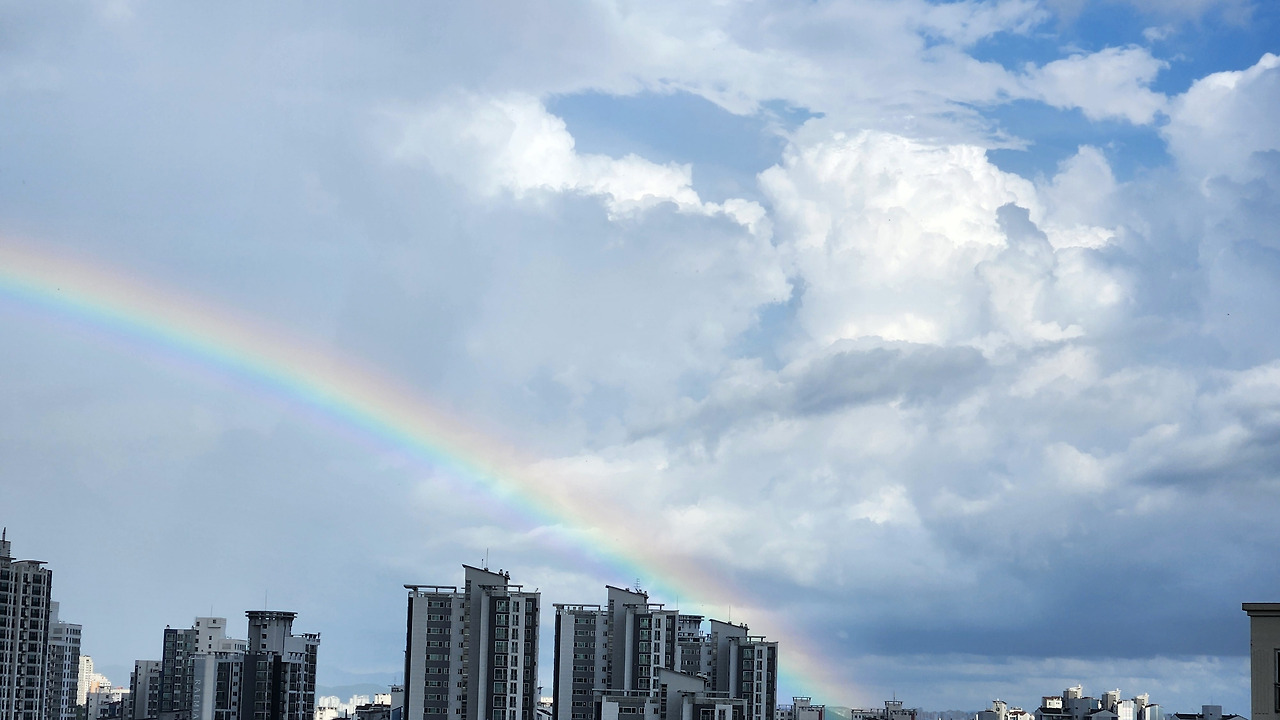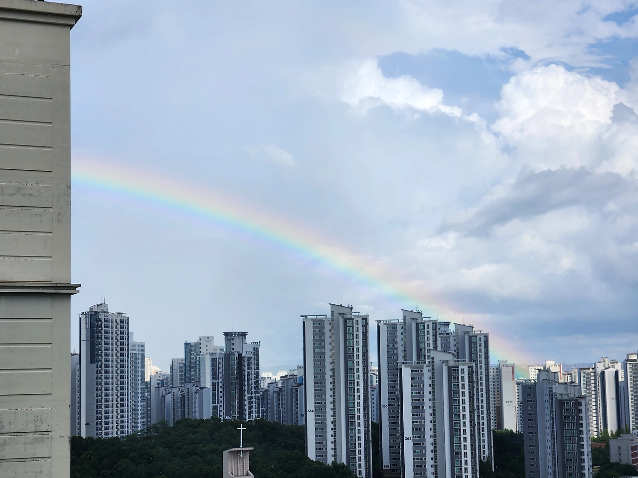 다음 날 아침, 조수의 손이 절대적으로 필요한 날이다. 사수 혼자서 도저히 할 수 없는 작업에는 조수도 단단히 마음을 먹고 본격적으로 팔을 걷어붙인다. 이렇게 마음의 유니폼을 입는 날에는 아무리 지치고 힘들어도 쉬이 짜증내거나 투덜거리지 않는다. 충분히 감당한다. 나름 방탄에 워터푸르프다. 땀을 뻘뻘 흘리며 가로 1400 짜리 욕실장을 들고 내리고 붙잡고 받치며 한몫 톡톡히 해낸다. 흐르는 땀을 닦으며 물 한 모금 마시는 사이 창밖으로 순식간에 무지개가 뜬다. 그림을 그려놓은 듯 유난히 선명한 무지개였다. 조수는 무지개가 사라질까 얼른 사수를 부른다. "우와-!" 하는 사이 순삭이다. 20층 높이 아파트 모퉁이에 걸쳐진 그 무지개는 그 순간 우리만 보았을지도 모르겠다.