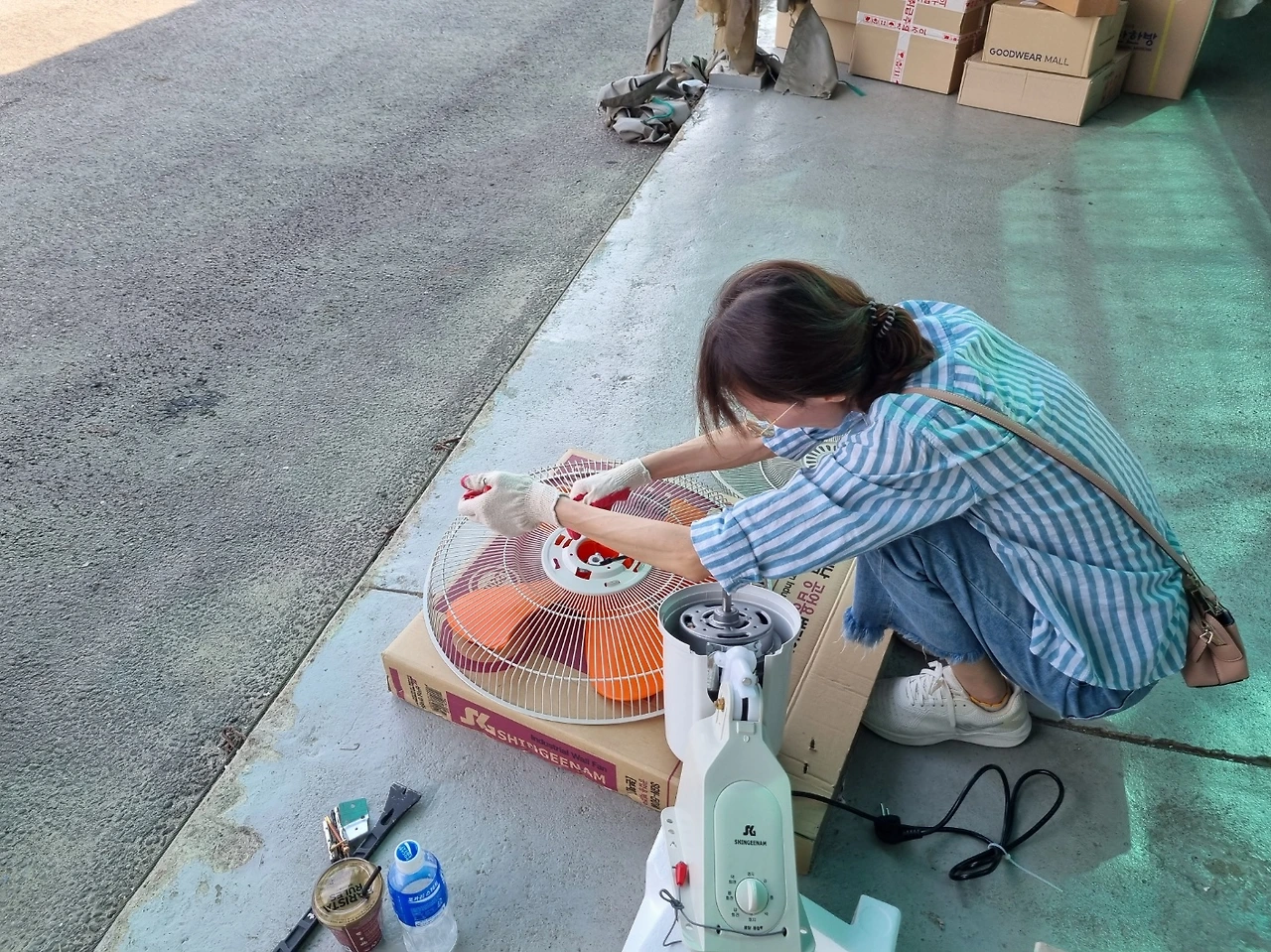 택배월드! 그 현장의 중심에 다녀왔다. 한낮의 무더위 속에서 택배 분류장 레일 주변을 따라 공업용 선풍기 일곱 개를 설치하는 작업이다. 처음에 분명 세 개라고 듣고 마음의 준비 없이 가볍게 따라나선 조수는 그 자리에서 결국 일곱 개를 모두 완성했다. 현장의 변수는 으레 있기 마련이다. - 입만 살아있는 구도사가 아니라고, 사진만 찍고 있지는 않다고 지금 생색내는 중이다. - 조수가 단순조립을 하는 동안 사수님은 더 고난도의 작업을 처리한다. 철판과 기둥에 타공작업이다.