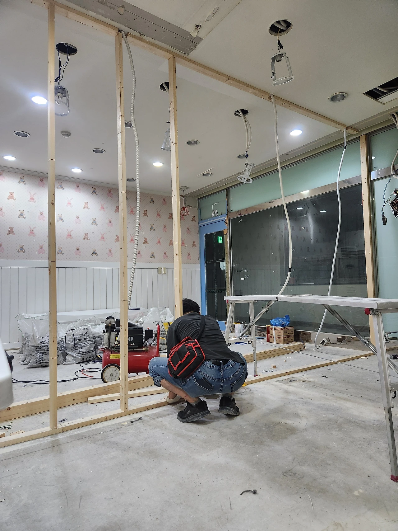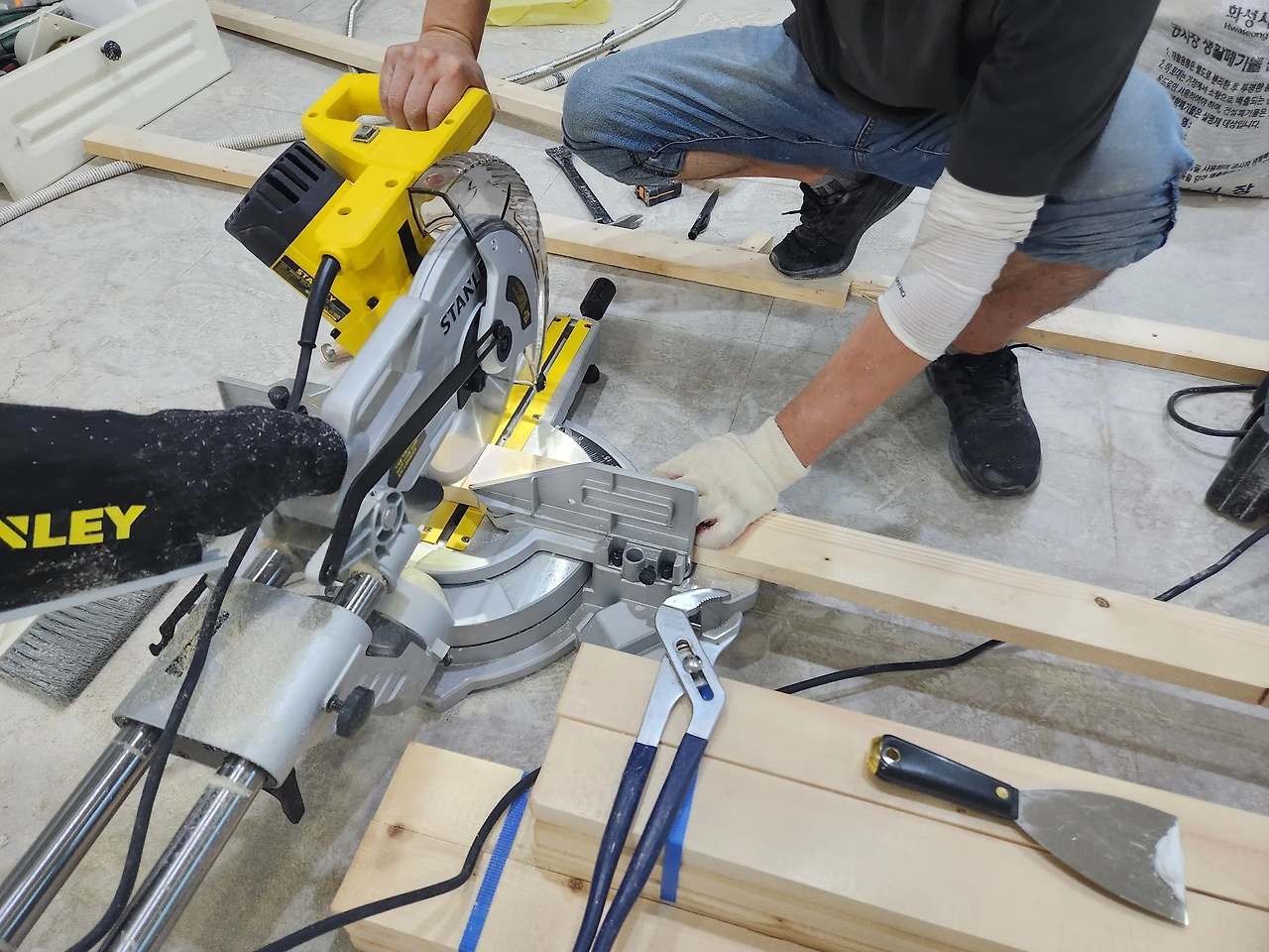 참으로 신기한 일은, 우주의 알고리즘이 작용을 하는지 새로운 장비를 들이면 그 장비를 쓸 일이 꼭 연이어 들어온다는 사실이다. 지난번 아파트에 누수 복구작업을 하며 목공에 재미를 들인 사수가 얼마 전에 새로 '거대하게' 투자한 각도절단기가 이번에도 한몫을 톡톡히 해냈다. 가벽을 만들며 덕분에 수월하게 작업할 수 있었다. 여기에 쓰이는 목재들 중에서 가장 기본적인 폭이 좁은 각목을 '다루끼'라고 부르고 그 두 배로 폭이 넓은 각목은 '투바이'라고 부른다. 어쩔 수 없다. 이 바닥에서 일하면서 풋내기 취급 당하지 않으려면 최소한 이 정도는 바로 알아들어야만 한다. 이로써 오늘 조수의 사전은 한 페이지 더 늘었다.