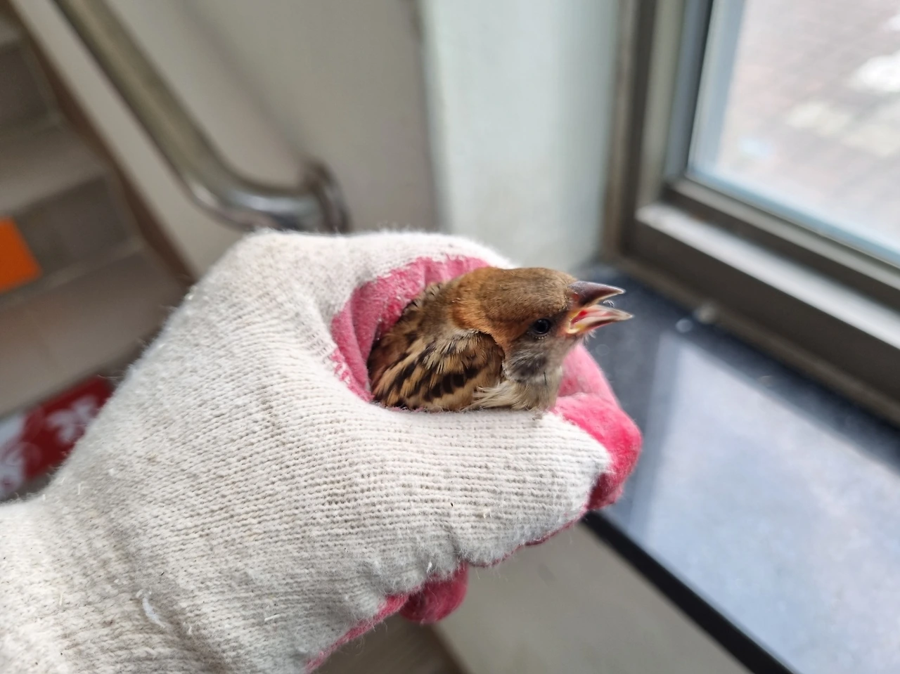 자재를 나르다가 건물 안에 들어와 길 잃은 어린 참새를 구했습니다. 여기저기 더 부딪혀서 다칠까 봐. (괴롭히는 거 아닙니다. 작업 중이라 땀이 차서 장갑을 못 벗었답니다.)