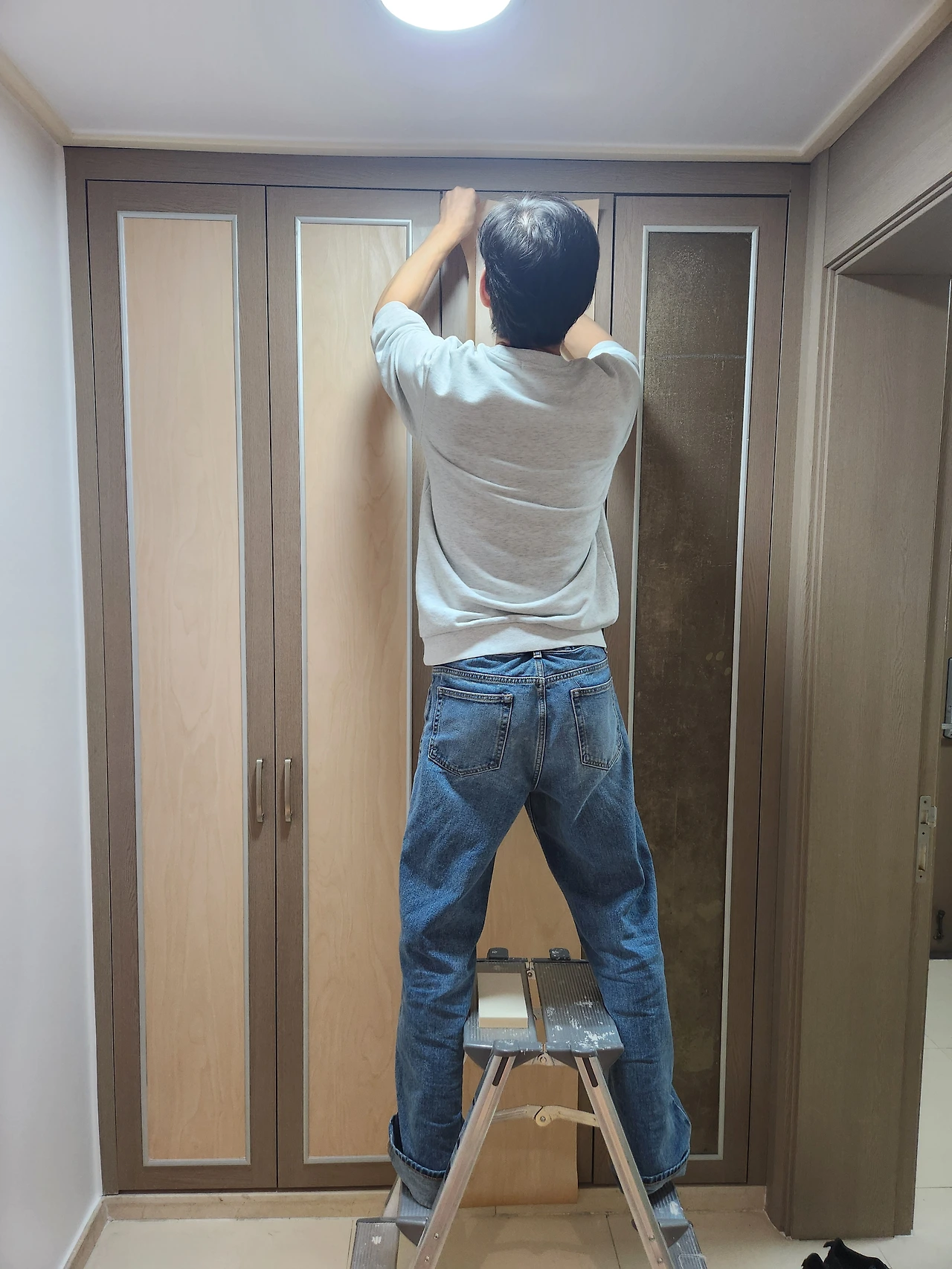 사수는 시트지 실습 끝판왕이다. 하나를 붙들고 집중하기 시작하면 곧바로 달인의 경지에 이르는 사수의 내공이 무섭다. 분위기가 이렇게 달라지다니 가성비가 참 좋기는 하다. 조수는 그저 열심히 잡아주고 프라이머를 바르고 시트지가 고르게 잘 붙도록 곁에서 열처리(드라이기)를 담당한다. 하다 보니 시트지 작업이 그래도 폐기물 처리나 뒷정리가 깔끔하고 비포어 에프터가 명확해서 작업할 맛이 난다. 체력적으로도 덜 부담되고.