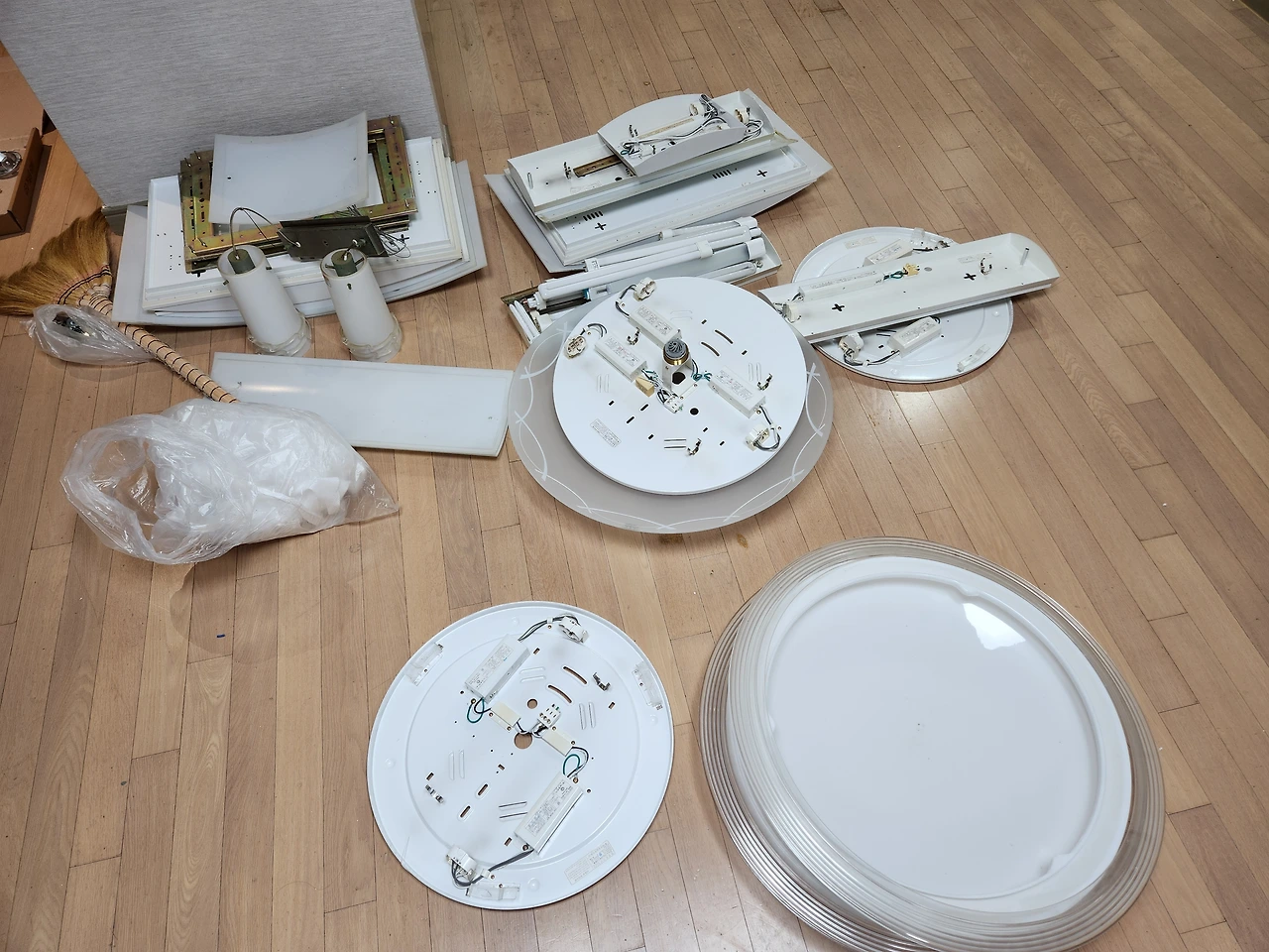 집수리를 다니다 보면 위생과 미화의 문제를 넘어 안전의 문제도 함께 포함되는 경우도 많다. 환경 개선이 곧 안전 개선이 되는 경우라고 해야겠다. 오래된 전등들은 어쩜 그리 크고 두껍고 무거운 유리갓으로 된 제품들이 많은지 이게 천장에 매달려있다고 생각하면 살짝 무섭기도 하다. 가장 힘든 건 본작업보다도 오히려 분리수거와 폐기물 처리다. 전등 교체 작업은 욕실장이나 변기에 버금가는 힘듦이다. 이 작업만 하는 것이 아니기 때문이다. 이미 앞서 오랜 시간 여러 작업을 거쳐오는 동안 체력을 모두 소진했는데, 끝난 게 끝난 게 아니었다. 돌아서면 낡은 잔해들이 한가득 기다리고 있다. 저녁 설거지가 하기 싫은 기분과 같다.