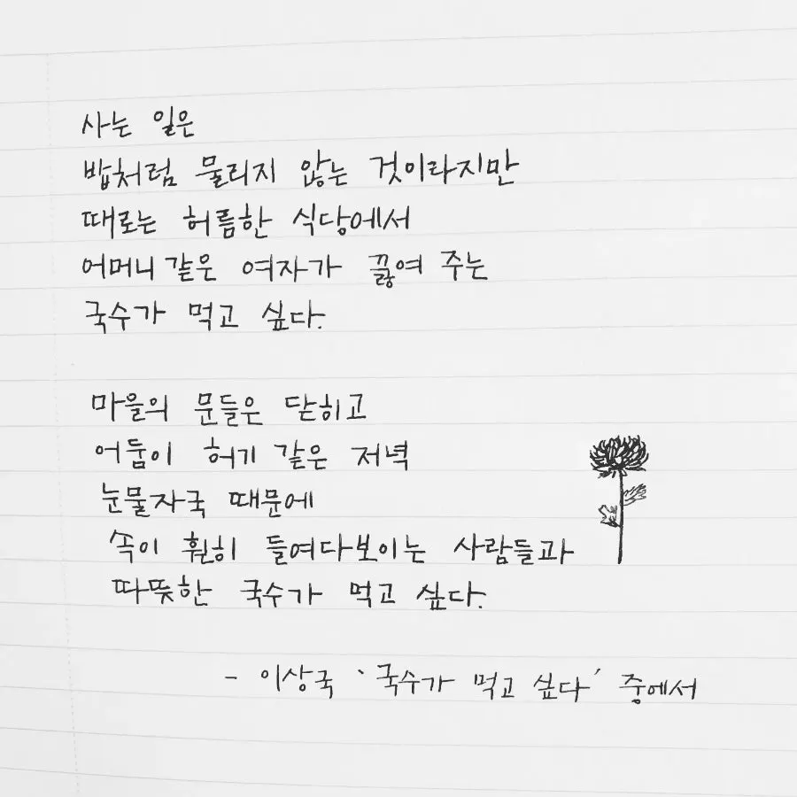 '세상은 큰 잔칫집 같아도어느 곳에선가늘 울고 싶은 사람들이 있어'- 이상국 '국수가 먹고 싶다'