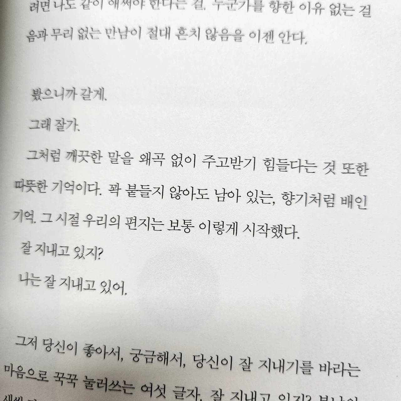 그처럼 깨끗한 말을 왜곡 없이 주고받기 힘들다는 것 또한 따뜻한 기억이다. 꽉 붙들지 않아도 남아 있는, 향기처럼 배인 기억.