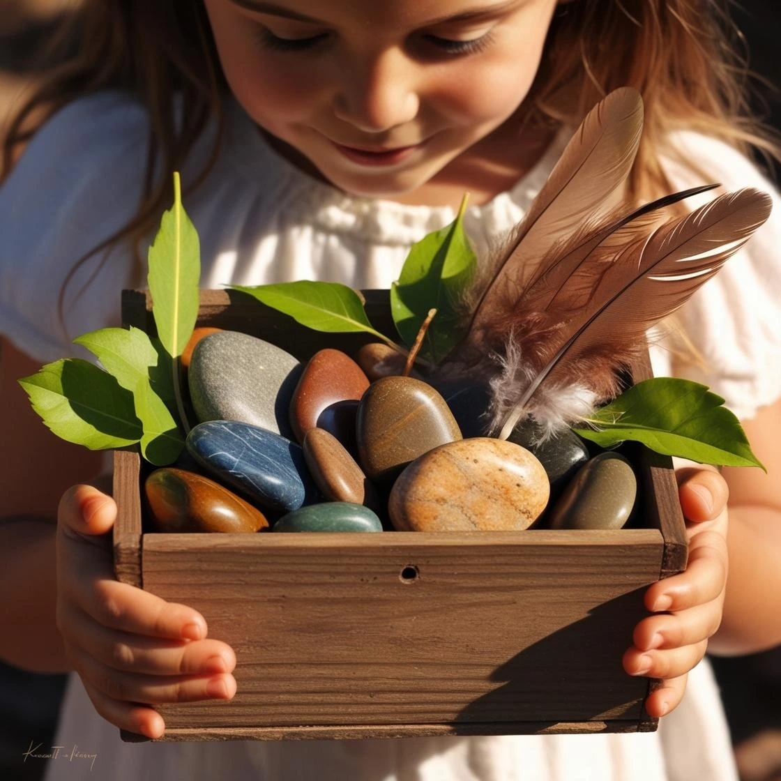 엄마와 나는 모험에서 가져온 작은 보물들을 상자에 담았어.