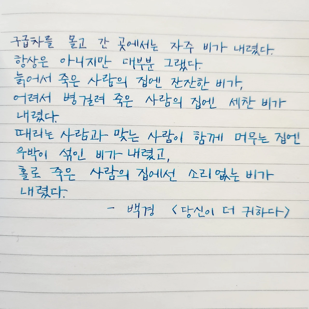 그 사람들 또한 나와 같은 무게의 삶을 살고 있다는 걸 깨닫자 마침내 비구름이 걷혔다.
