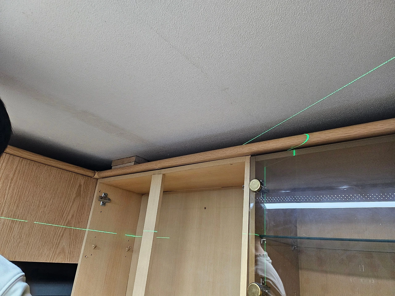 뒷벽과 천장에 지지목을 덧대어 보강하고, 처지면서 전체적으로 틀어진 몸체와 문짝들을 바로 잡아 주었다. 마지막으로, 천장 부위를 가려주는 몰딩이 없는 탓에 겉으로 드러나 보이는 지지목에 시트지를 입혀주는 디테일로 작업에 마침표를 찍었다. 좀 느리고 시간이 더 걸리더라도 할 건 해야지.