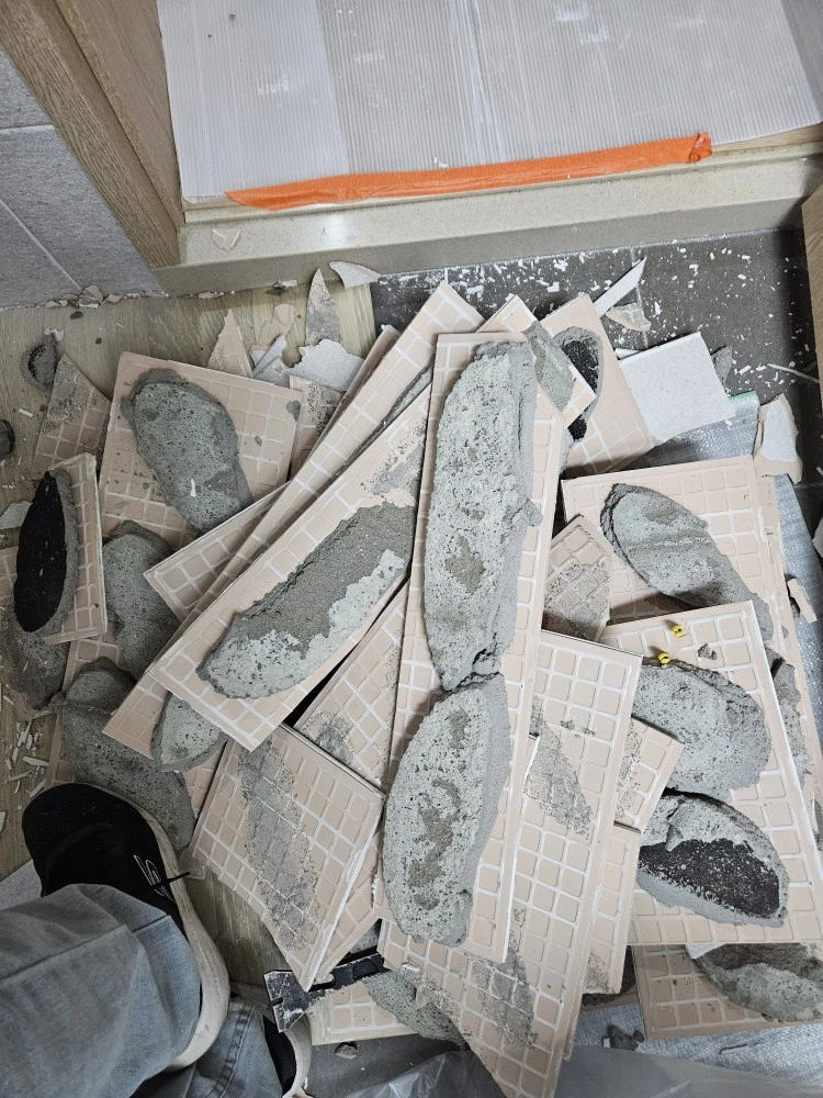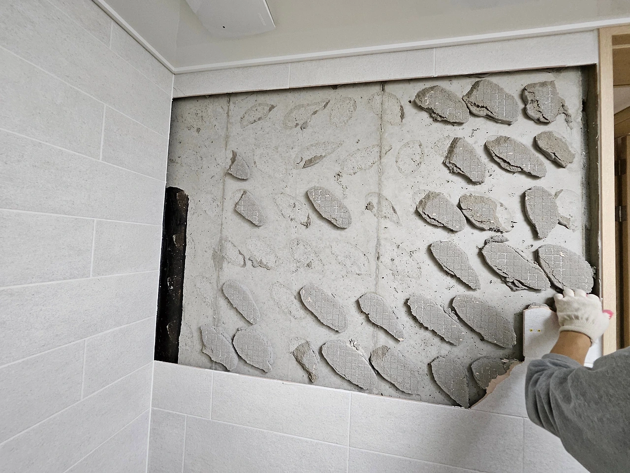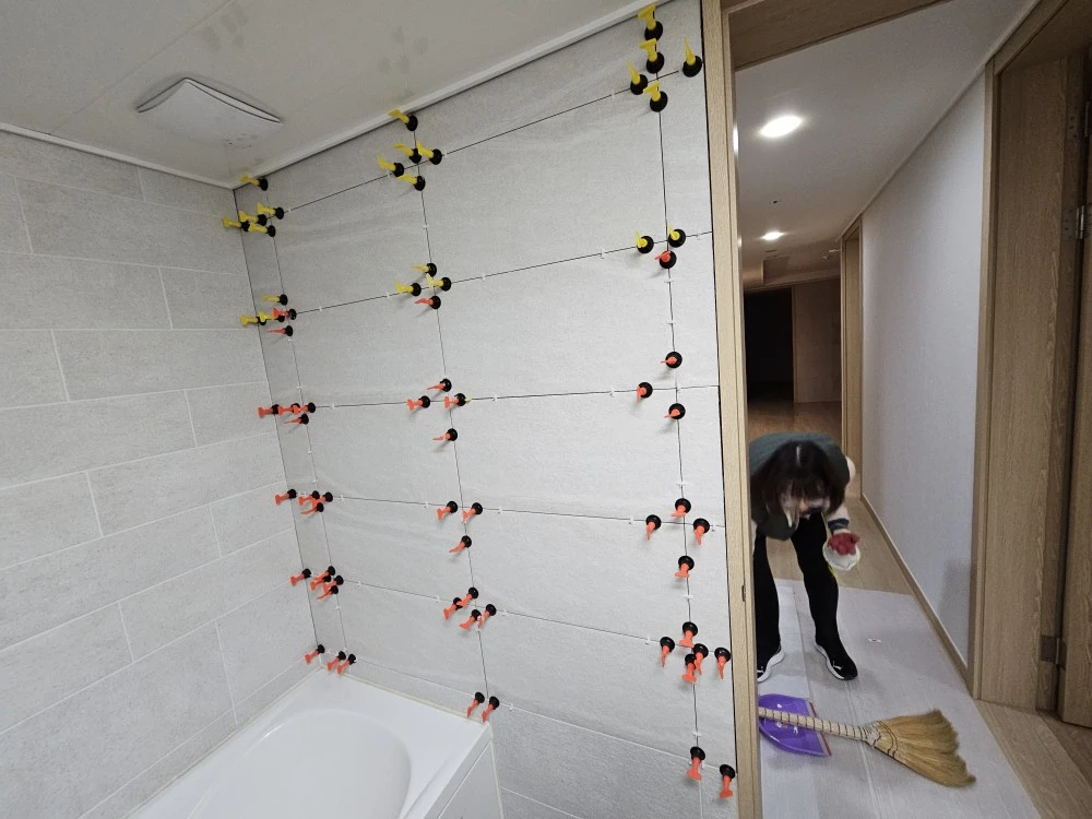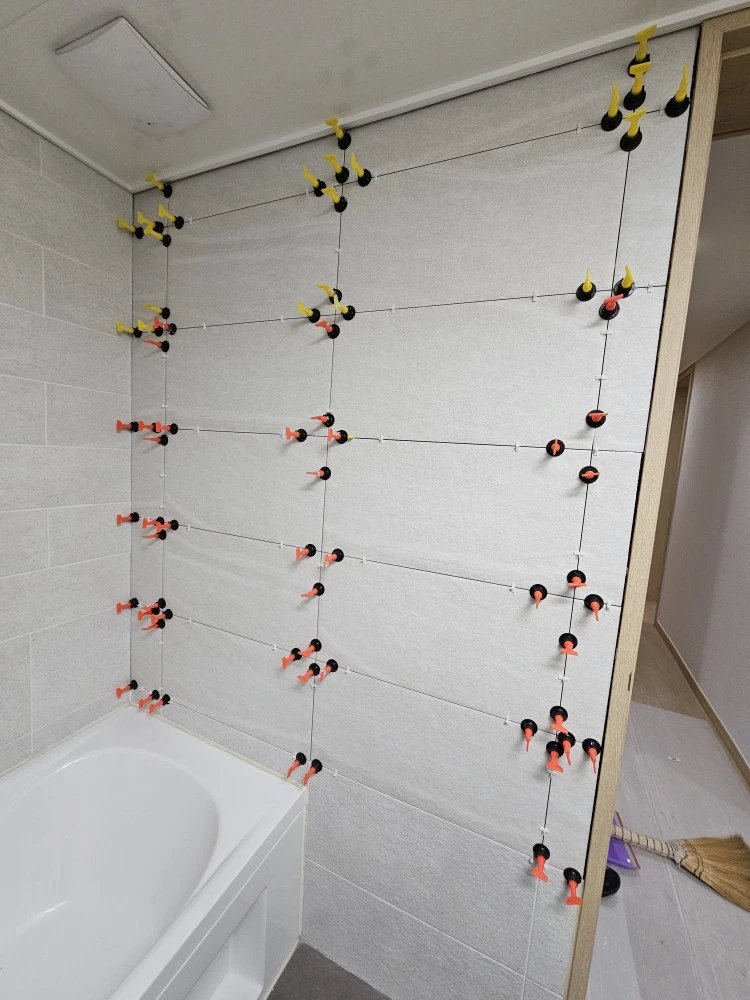 기존 타일을 철거하고 표면을 평탄화한 후, 단차를 맞추기 위해 떡밥을 붙이고 타일이 잘 붙을 수 있도록 속을 골고루 채워야 한다. 타일을 붙이고 곳곳에 간격을 유지해 줄 스페이서를 끼운 후, 돌돌이 평탄 클립을 끼워 네 모서리를 고르게 붙잡아 줄 수 있도록 고정시킨다. 다 해놓고 나니 꼭 타일 벽에 부항을 떠놓은 모양새다. 정말로 부항을 뜨고 싶은 곳은 사수와 조수의 어깨와 등허리가 아니던가?
