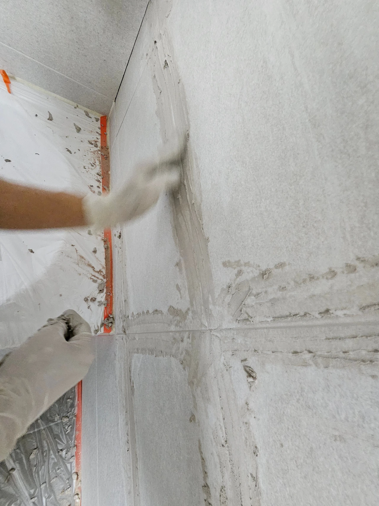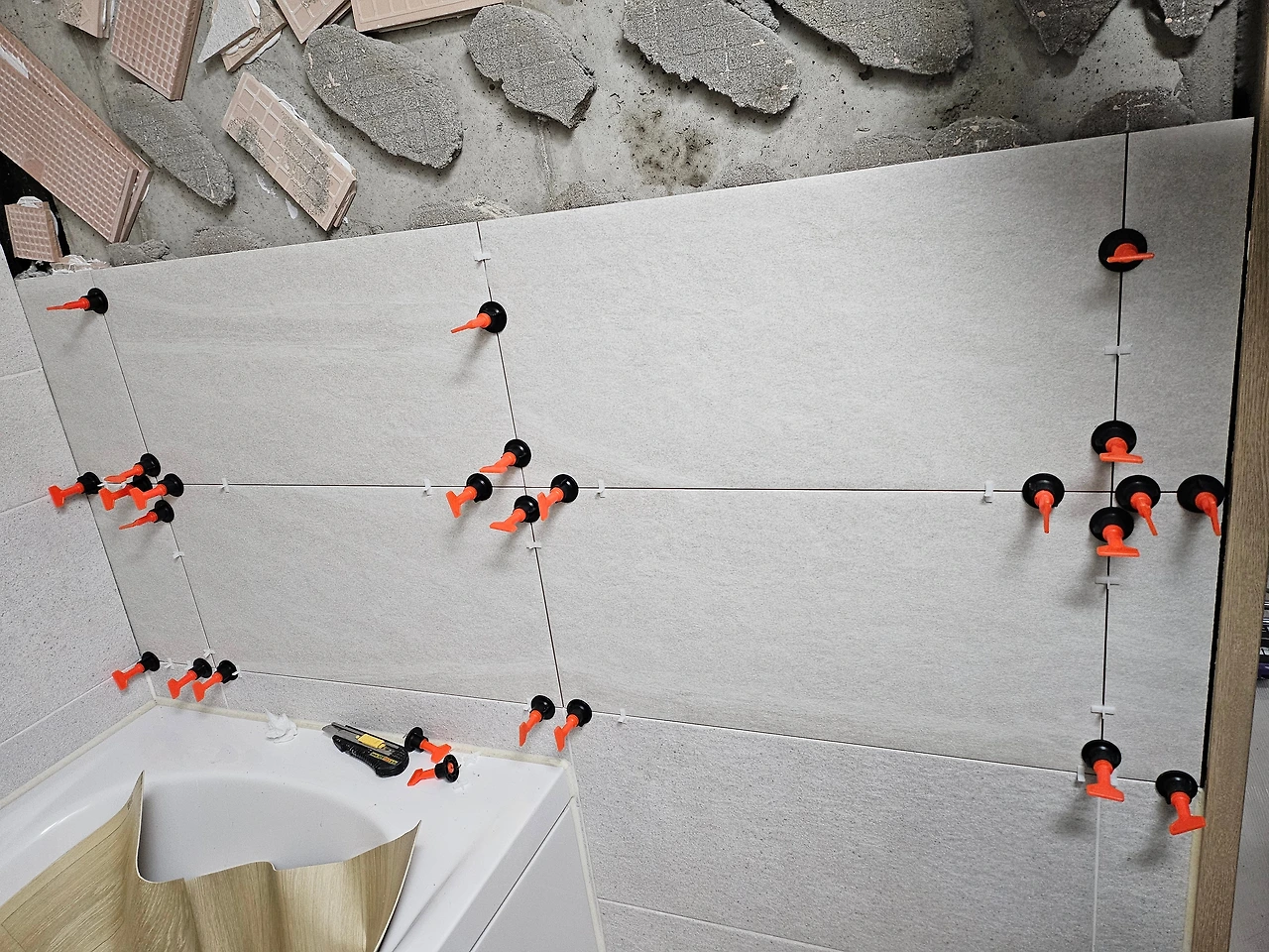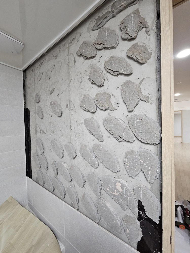 기존 타일을 철거하고 표면을 평탄화한 후, 단차를 맞추기 위해 떡밥을 붙이고 타일이 잘 붙을 수 있도록 속을 골고루 채워야 한다. 타일을 붙이고 곳곳에 간격을 유지해 줄 스페이서를 끼운 후, 돌돌이 평탄 클립을 끼워 네 모서리를 고르게 붙잡아 줄 수 있도록 고정시킨다. 다 해놓고 나니 꼭 타일 벽에 부항을 떠놓은 모양새다. 정말로 부항을 뜨고 싶은 곳은 사수와 조수의 어깨와 등허리가 아니던가?