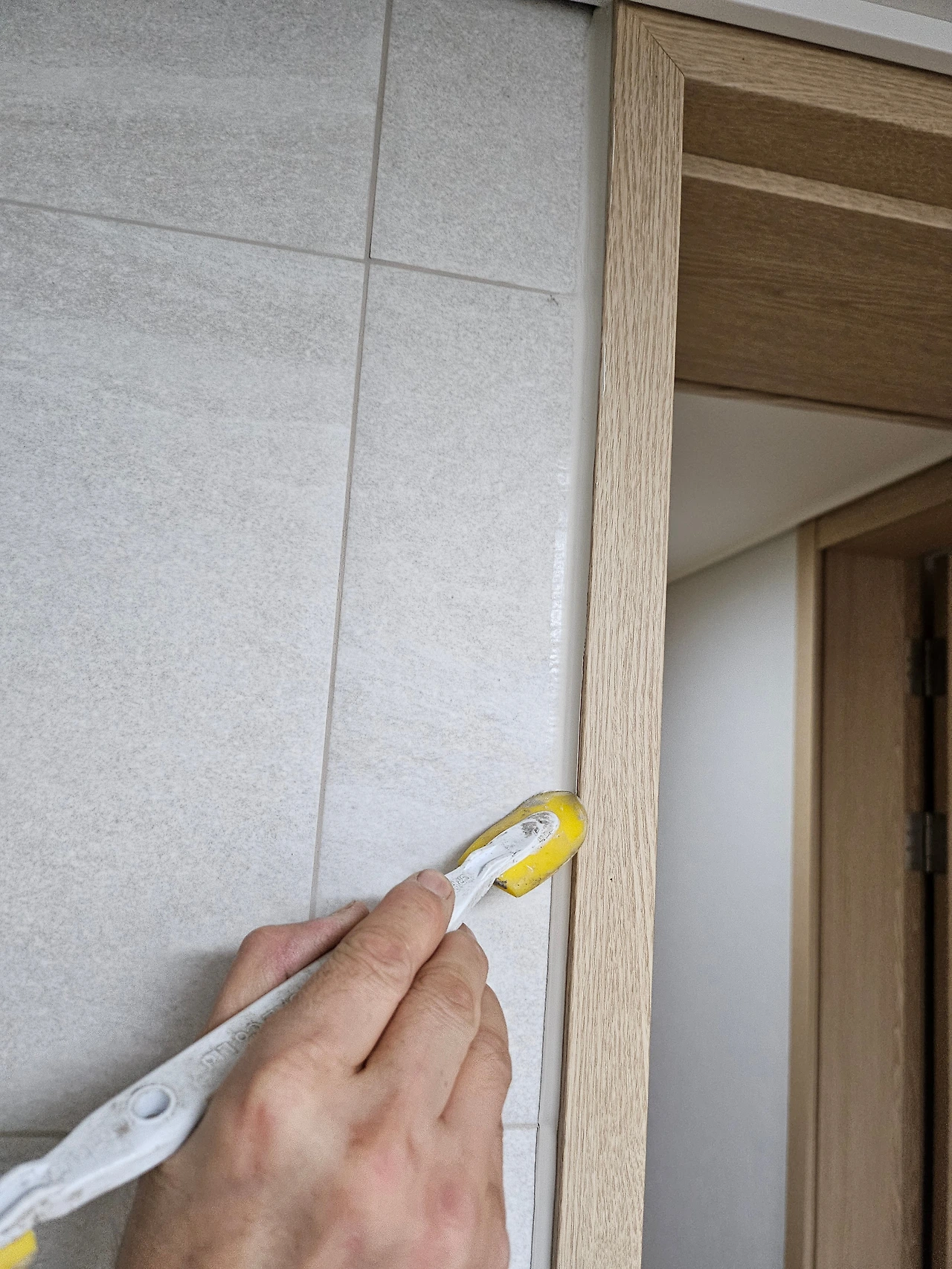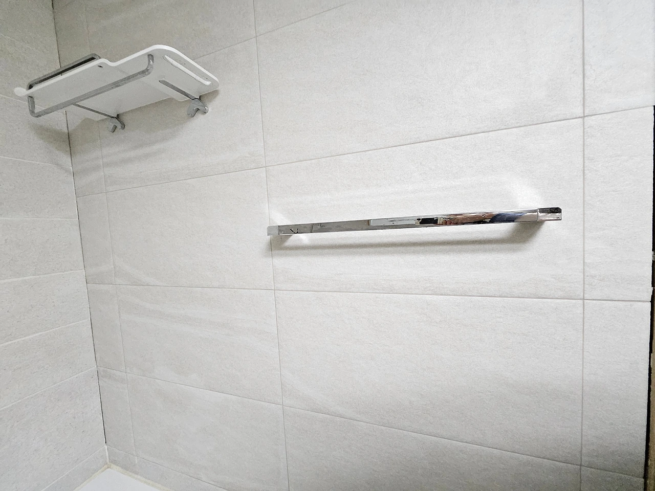 타일 작업은 하루에 끝낼 수 없다. 넓은 면적이라 하루 정도 속까지 완전히 마르도록 양생하는 시간이 필요하다. 잘 마르면, 클립과 스페이서를 제거하고 수건걸이를 원래 자리에 타공해서 다시 붙여 주어야 한다. 이 작업이 가장 조심스럽다. 순간 삐끗하면 이 역시 말짱 도루묵이 되어 버리니까. 무사히 성공하고 나면, 매지를 꼼꼼히 채우고 실리콘으로 마감한다. 작업을 모두 끝마치고 뒷정리를 하고 다시 바라보며 사수는 스스로 결과물이 마음에 드는지 꽤나 흡족해한다. 다시 한번 느끼지만 손이 하는 일이 참으로 경이롭다. 가히 "아름답다!" 할만하다.