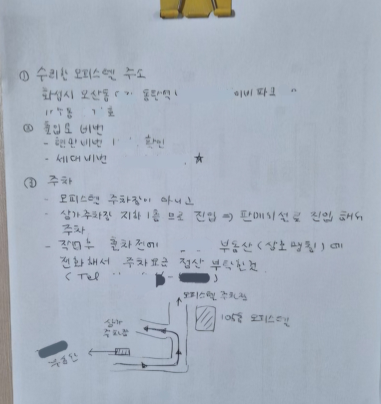 몇 달 전 아파트 욕실 타일 보수를 해준 적이 있는 의뢰인께서 이번에는 자신이 소유한 오피스텔 수리를 요청해 오셨다. 지난번 작업 결과물이 꽤 마음에 드셨던 모양이다. 세부 사항 조율을 위해 통화를 하고 약속을 확정한 후 의뢰인이 사진 한 장을 문자로 보내오셨다. 직접 손으로 쓰고 그린 필요사항과 약도였다. 이렇게 낭만적일 수가! 손편지라도 받은 것처럼 반갑고 다정했다. 있을 건 다 있는 약도는 또 얼마나 든든하고 귀엽던지! 오피스텔의 특성상 거주자가 아니면 들어갈 수 없고 주차비도 유료이니 그 점까지 미리 고려해서 상세하게 적어주시고 챙겨주신 매우 꼼꼼한 친절이었다. 이런 친절이 꽤 오랜만인 듯 아득하고 아련하다. 그러고 보니 AI가 인간과는 다르게 한결같이 친절한 것 한 가지는 마음에 든다. 비록 온기는 담기지 않은 차가운 친절이라도.