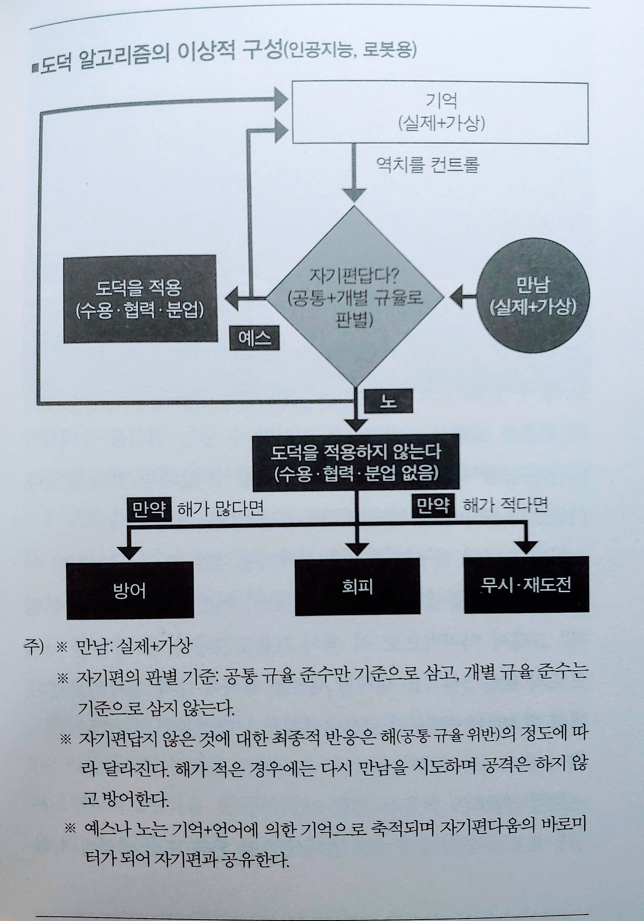 도표는 로봇에게 장착할 도덕 엔진의 알고리즘 구성도이다. 인간과 다른 점은 로봇 자신에게 해를 끼친다 해도 회피 내지는 방어만 하도록 설정한 것이다. 인간의 경우라면 이런 순간 반격 혹은 공격성이 극대화되는 모습이 될 수 있다. 로봇에게는 이런 공격성을 제어할 필요성이 있을 것이다. 그래야 인간의 생명에 위험을 주는 행위가 근본적으로 발생하지 않게 될 것이다.