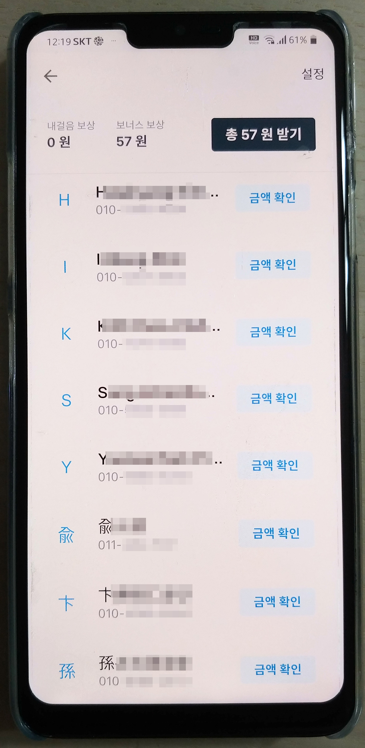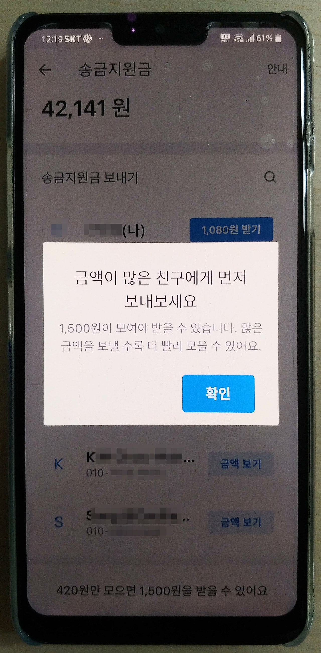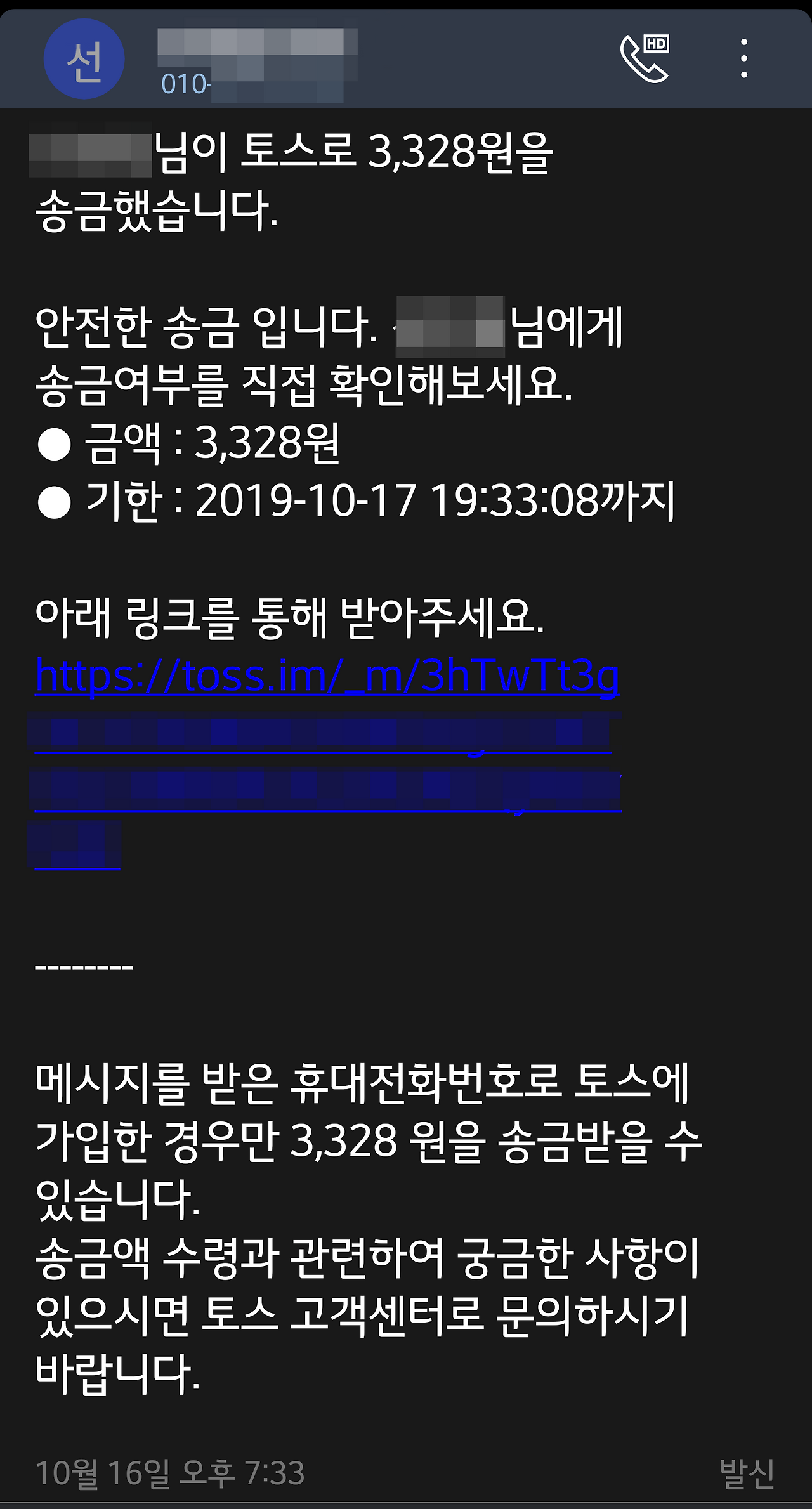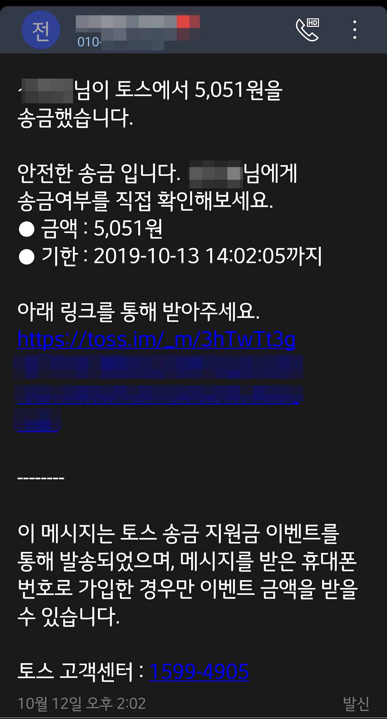 그 방법 중 하나가 기존 회원을 이용한 신입 회원 모집이다. 송금 지원금(9만 원), 응원 위크 지원금(10만 원), 돈상자 뿌리기(10만 원) 등 각종 명목으로 기존 가입자에게 준다. 물론 이 돈을 그냥 다 주는 것이 아니다. 이 돈을 스마트 폰 주소록에 등록된 지인들에게 뿌리라는 것이다. 돈 액수는 자신이 정하지 않는다. 2~3원 수준에서 시작해 5천여 원까지 토스 앱에서 정한다. 살펴보니 토스에 이미 가입한 사람에게는 2~11원까지 송금이 되었고 미가입한 사람은 3천~5천여 원이 랜덤 하게 보내졌다. 결국 미가입한 사람 위주로 보내야 송금 지원금 9만 원을 빨리 소진할 수 있고 보상금조로 1500원을 받게 된다. 1500원이 안된 중간에 쌓인 금액만 받을 수는 없었다. 무조건 1500원이 되어야 받을 수 있다. 아무튼 금액을 보내게 되면 이런 문자가 상대방에게 간다.