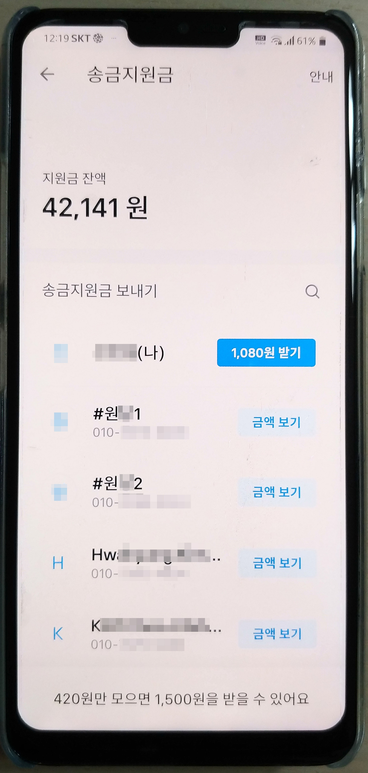 1080원만 받으려 버튼 눌렀더니 1500원이 되어야 받을 수 있다는 메세지가 나타났다.