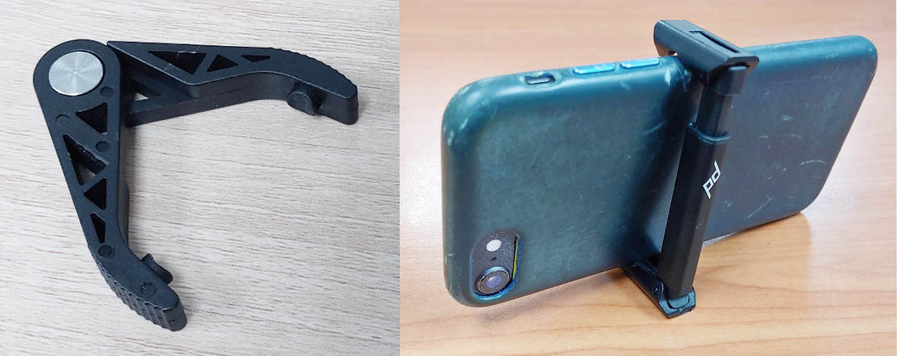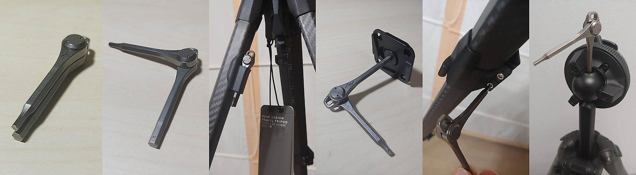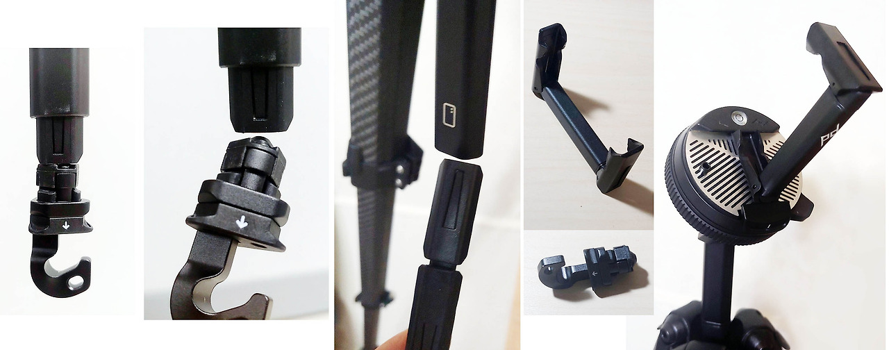 bushing removal tool(왼쪽)은 트라이포드 다리 분해 시 필요하다.트라이포드 가운데 기둥 하단부에 있는 갈고리는 안정성 강화를 위해 가방을 걸 수 있다. 이 갈고리를 잡아당기면서 돌리면 분리된다. 자석이 있어 바로 빠지지는 않는다. 분리된 후 따라 나오는 것이 스마트폰 용 거치대이다. 스프링이 있어 스마트폰 크기에 맞춰 끼울 수 있다. 스마트폰을 끼운 뒤 트라이포드에 설치하면 된다.