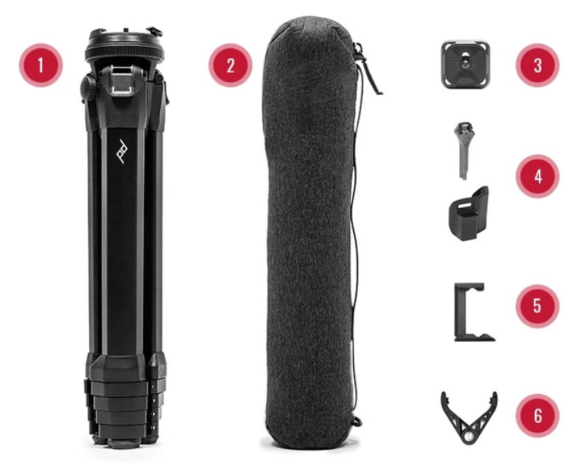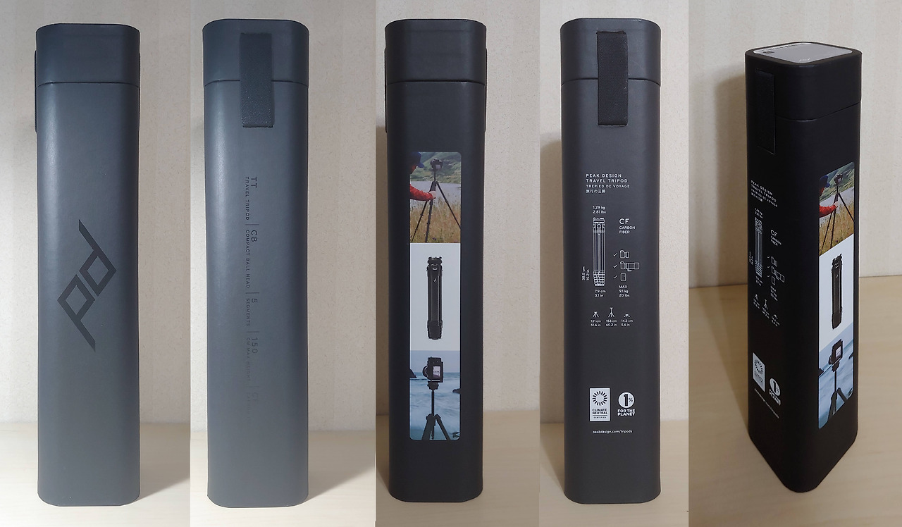 픽 디자인(Peak Design : https://www.peakdesign.com)의 'Travel Tripod 5 Section CARBON'은 이런 불편함을 해소하기 위해 만들었다고 제작사는 말한다. 제품명에 '여행(Travel)'이라는 문구가 있듯이 간편한 휴대가 첫째 목적이다. 크기는 약간 큰 생수통 정도이다. 그래서 배낭형 카메라 가방 옆 보조 주머니에 생수통 대신 넣고 다닐 수 있다. 이렇게 작아진 비결은 절묘한 디자인 설계에 있다. 기존 트라이포드는 원통형 다리 3개가 원통형 중앙 기둥을 감싸는 형태가 일반적이다. 그래서 쓸데없는 빈 공간이 생기고 이를 포함해 전체 크기가 커졌다.