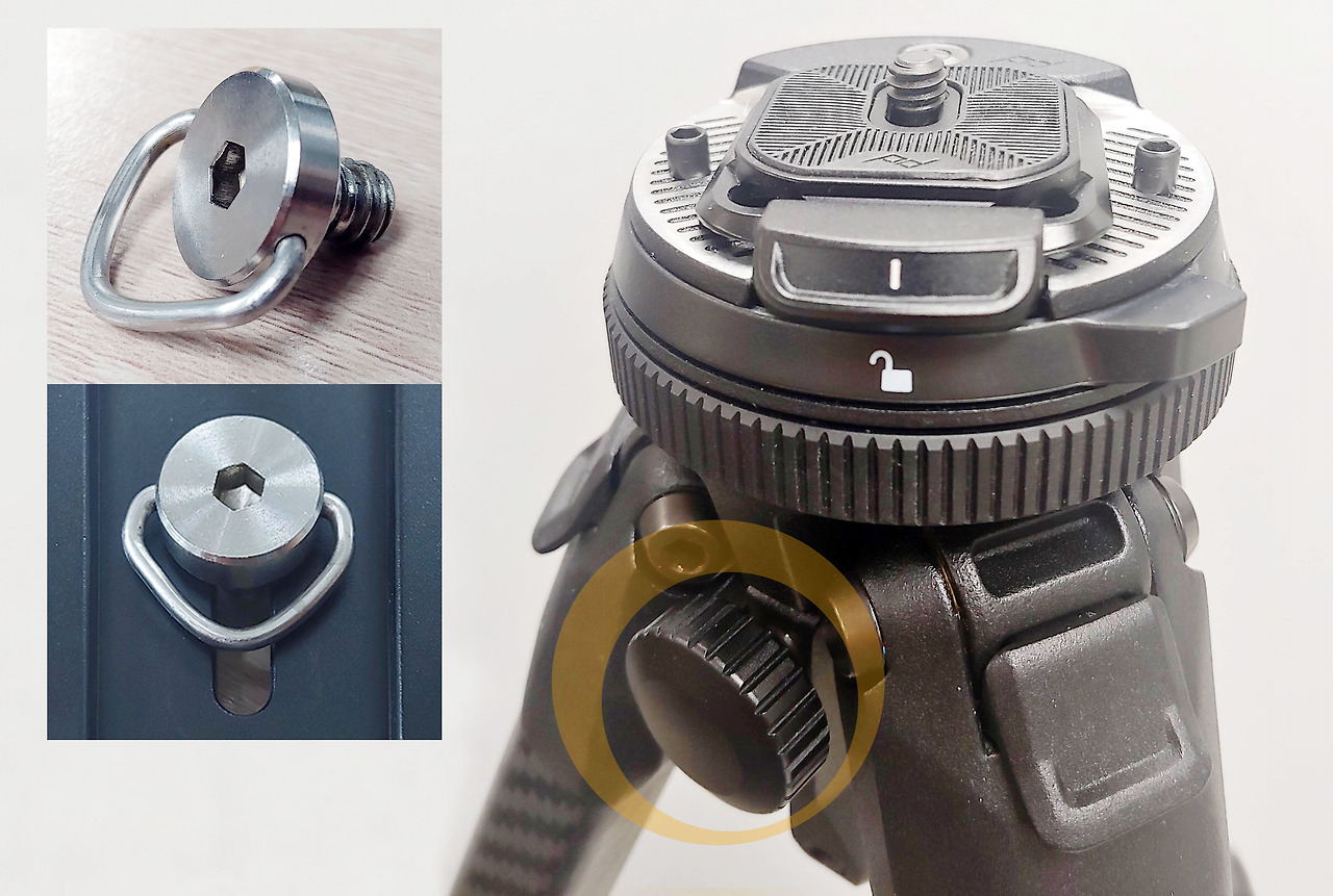 조임 나사가 작은 편이다. 나비형 나사(작은 사진)를 사용하면 조이고 풀 때 더 편리할 것 같다.'Travel Tripod 5 Section CARBON' 트라이포드를 사용할 때 가운데 기둥은 높이 올리지 않는 것이 안정적일 듯싶다. 굵기가 가늘어 흔들림 발생 우려가 높다. 이런 현상을 방지하기 위해 기둥 아래 부분에 있는 갈고리에 가방 등을 걸어 무게 중심을 낮게 잡아줄 수 있게 만들었다. 장시간 노출을 주는 밤하늘 별 궤적 촬영 등을 한다면 (바람 영향을 받을 수 있기에) 굳이 높이 올릴 필요는 없어 보인다.