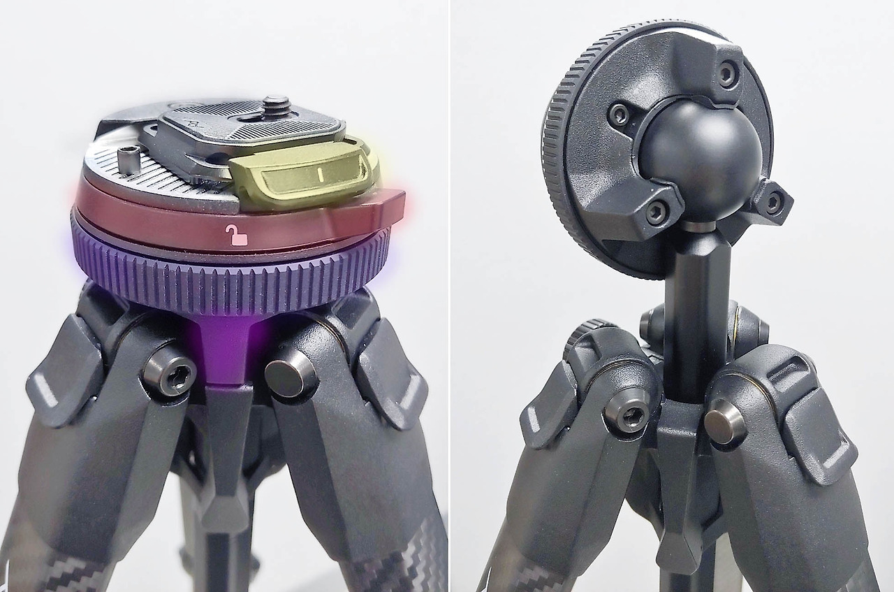볼 헤드 부분이 가운데 기둥과 일체형이기에 살짝 위로 올려야 기능을 제대로 쓸 수 있다.노란색으로 칠한 부분은 브래킷(bracket)(혹은 플레이트:plate)를 고정해 주는 버튼이다. 누르면 브래킷을 뺄 수 있다. 사용 중 이 버튼이 눌려 카메라가 빠지는 것을 방지하기 위해 붉은색으로 된 링을 왼쪽으로 돌려 고정시켜야 한다. 'Travel Tripod 5 Section CARBON' 트라이포드는 볼 헤드 부분을 가운데 기둥과 일체화시켰다. 그래서 가운데 기둥을 오른쪽 사진처럼 최소한 원판 지름 이상으로 올려야 가로, 세로 모든 방향으로 움직일 수 있다. 푸른색 부분을 좌우로 돌려 볼 헤드를 고정하거나 풀어 줄 수 있다.