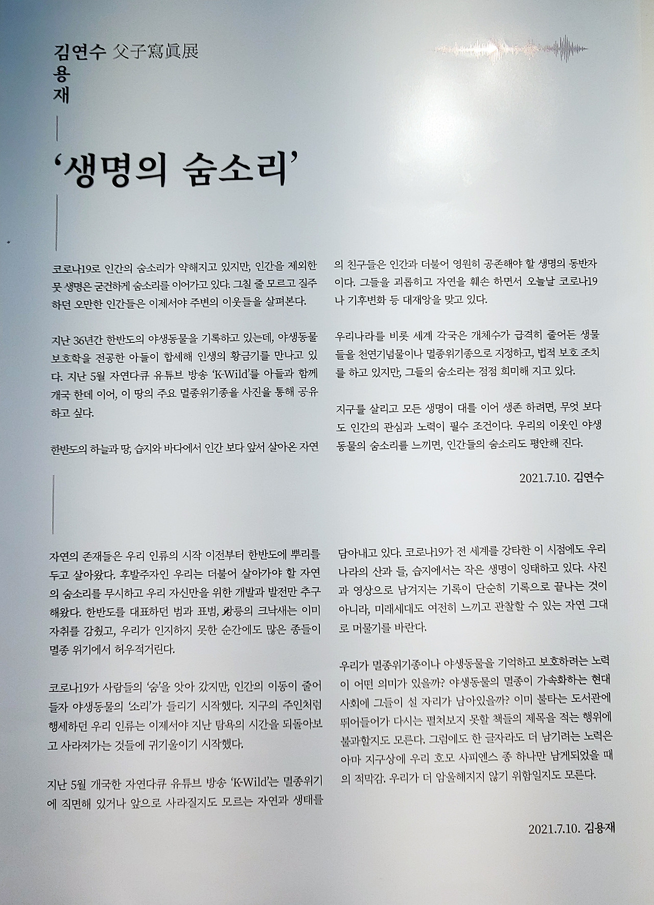 서울시 종로구 인사동길 7에 위치한 KOTE(https://www.kote.kr/about-us)라는 곳이 있다. 전시장, 카페, 레스토랑 등이 한 자리에 있는 복합 문화공간이다. 이곳 전시장에서 생태 사진가 김연수와 아들 김용재(녹색서울시민위원회 간사)씨가 함께 사진전을 열고 있다. 주제는 ‘생명의 숨소리’. 야생동물 보호학을 전공한 아들과 함께 인간의 무관심 속에 어렵게 생명을 이어가는 이 땅의 멸종위기종을 사진으로 보여준다.