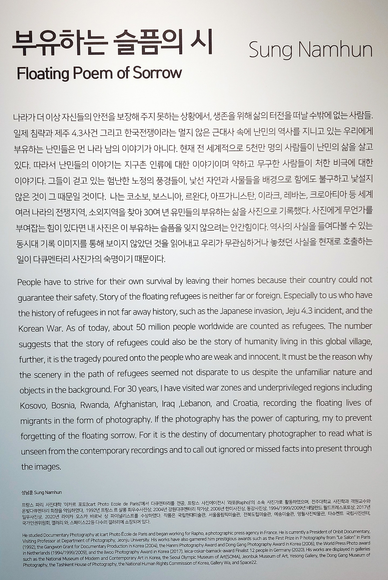 성남훈 사진가의 사진은 이전에 다른 전시 공간에서도 본 사진이 있으니 더 부연 설명할 필요는 없을 것 같다. 이주민, 난민들을 촬영한 사진은 지구 공간에서 지금도 일어나는 인간계의 부조리를 가감 없이 보여준다.