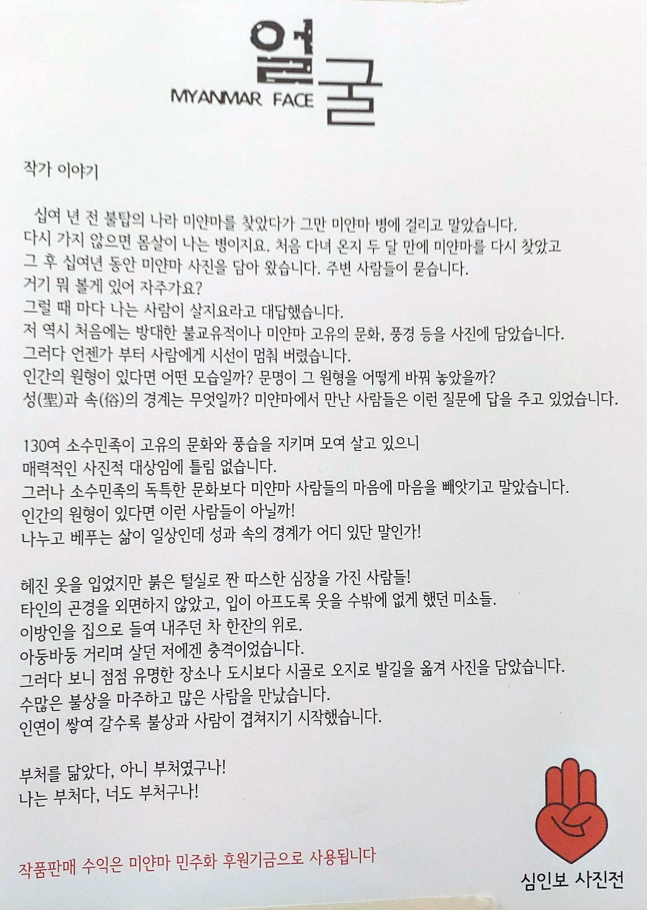 신을 믿는 인간은 자신과 비슷한 모습으로 신의 형상을 표현한다. 부처상을 보게 되면 인도 간다라 미술에서 보이는 부처의 모습과 달리 석굴암의 석가 여래불은 코도 낮아지고 둥글둥글한 얼굴형이 되었다. 미얀마의 부처는 미얀마의 보통사람처럼 생겼음을 심인보 사진가는 사진으로 극명하게 보여준다. 전시장에서 판매하는 사진집은 민주화 운동 중인 미얀마를 돕는 기금으로도 사용된다고 한다. [빈모]